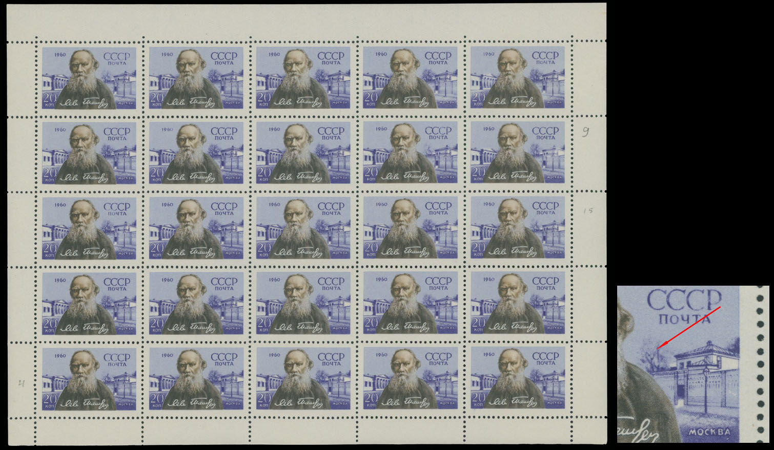 1960, Leo Tolstoy, 20k violet and brown, complete sheet of 25 (5×5), ”tree without branches” variety on stamps from positions 1, 9, 15 and 21, full OG, NH, VF and rare in complete sheet, these error presents only in a small part of printing run, Est. $400-$500, Scott #2391 var