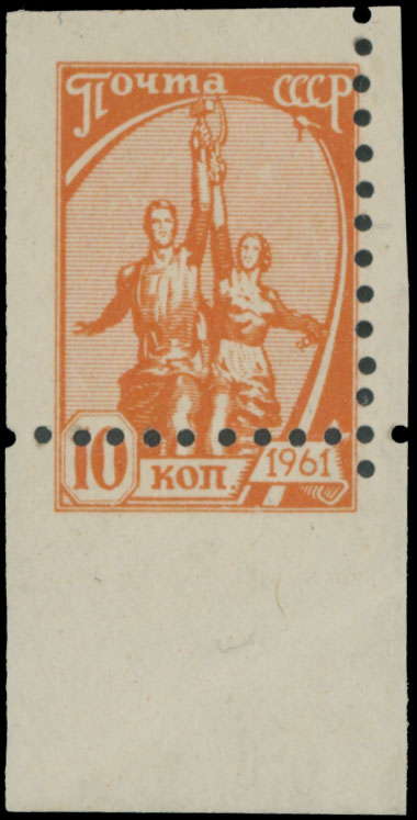 1961, definitive issue, Workers Monument, 10k orange, bottom sheet margin single imperforate at top and on the left with misplaced perforation on the right and at the bottom, full OG, NH, VF and a spectacular item, Est. $150 -$180 , Scott #2446 var