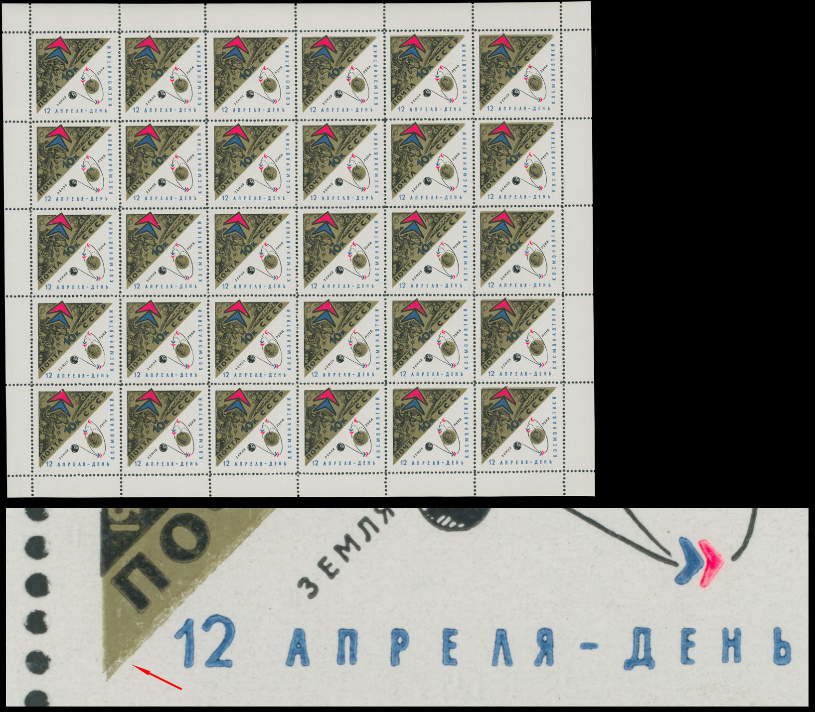 1965, Cosmonauts’ Day, 10k multicolored, transition sheet of 30 (6×5) includes more then a half stamps with double impression of gold color, unfolded and post office fresh, full OG, NH, VF and very rare, only a handful such sheets were found, no more then five remain unbroken, Est. $1,500-$2,000, Scott #3193, var