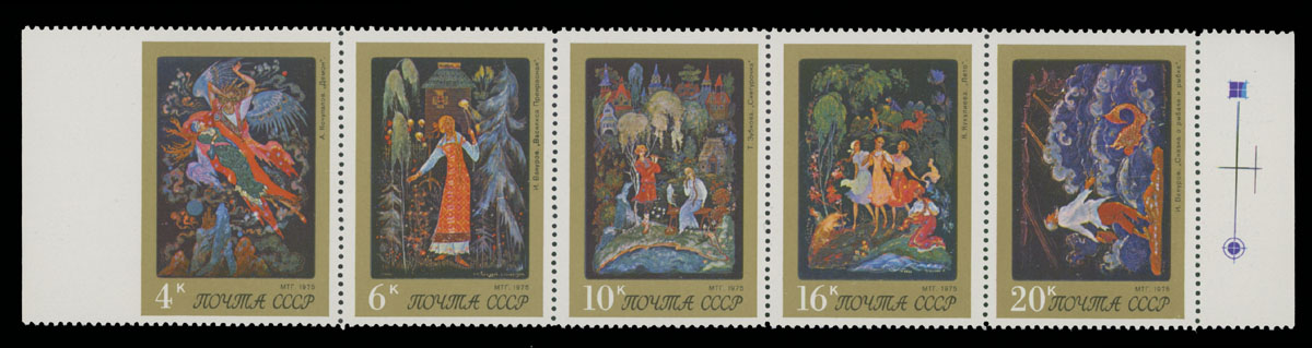 1975, Palekh Arts, 4k-20k, two-side margin se-tenant strip of five, imperforate on the left, full OG, NH, VF, Est. $300- $350 , Scott #4404 var