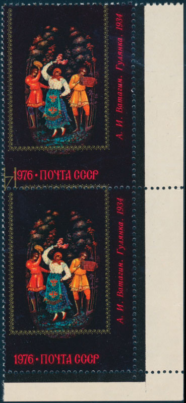 1976, Palekh Paintings, 14k multicolored, gold color (ornament and denomination) is inverted, bottom right corner sheet margin vertical pair, lower stamp has no value, full OG, NH, VF and very rare major error, only one sheet of 25 stamps has been discovered, Est. $3,000- $3,500, Scott #4484 var