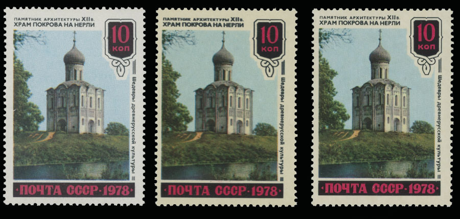 1978, Old Russian Arts, Pokrova-on-Nerl’ Church, 10k multicolored, two varieties – stamp printed on ordinary paper without lacquered coating, the other one – double impression of black color, full OG, NH, VF and scarce, especially stamp without glazing, a common stamp is added for comparison, Est. $300-$350, Scott #4710 var