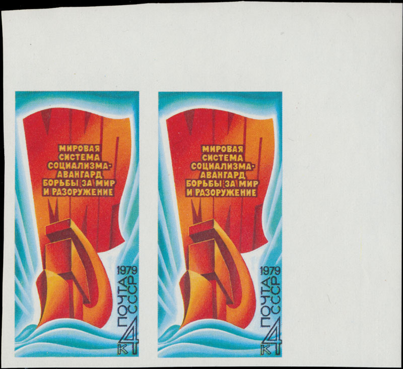 1979, Peace Program, Flag and Soviet Emblem, 4k multicolored, top right corner sheet margin horizontal imperforate pair, full OG, NH, VF, the rarest and most expensive modern imperf error, Est. $5,000-$6,000 , Scott #4795 imp