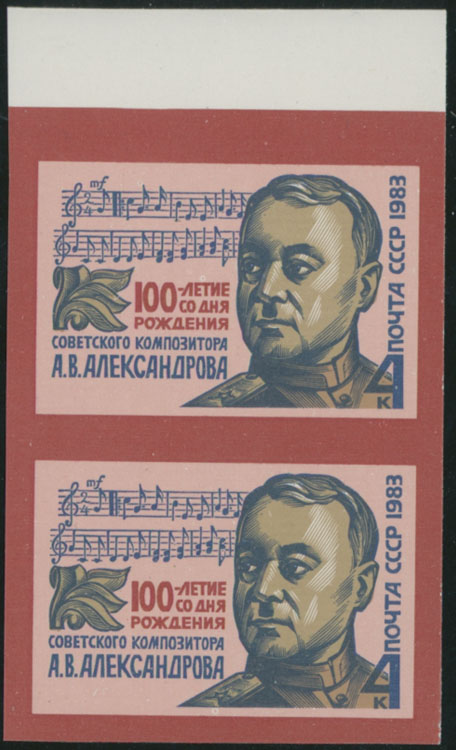 1983, 100th Anniversary of the birth of Soviet Composer A. V. Aleksandrov, 4k multicolored, top sheet margin vertical imperforate pair, full OG, NH, VF, Est. $1,200-$1,500 , Scott #5128 imp