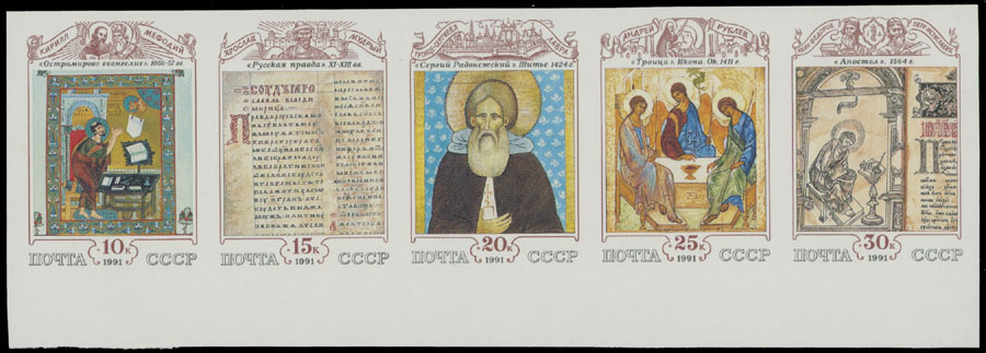 1991, Cultural Heritage, 10k-30k, bottom sheet margin imperforate se-tenant strip of five, nice margins at all other sides, full OG, NH, VF and very rare, Est. $4,000-$4,500 , Scott #6008 imp