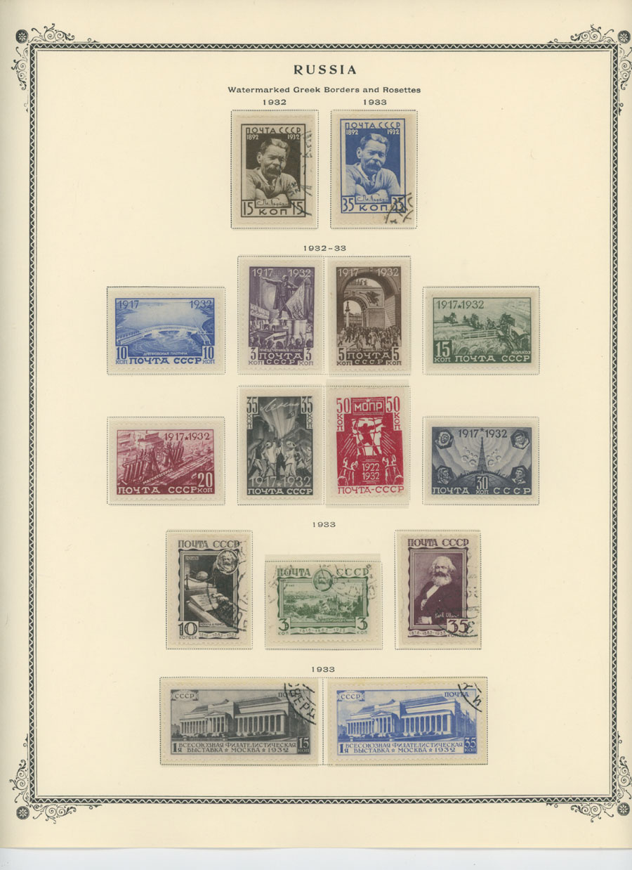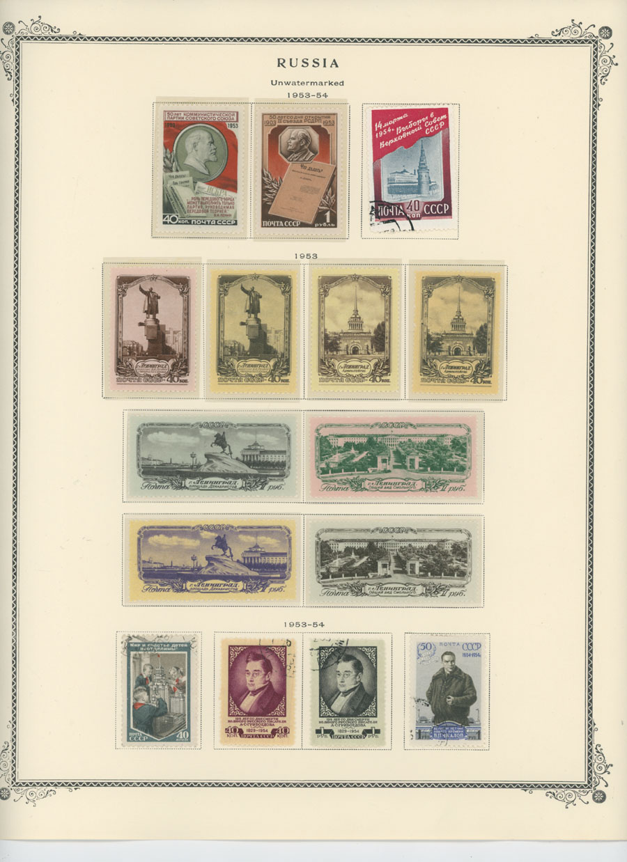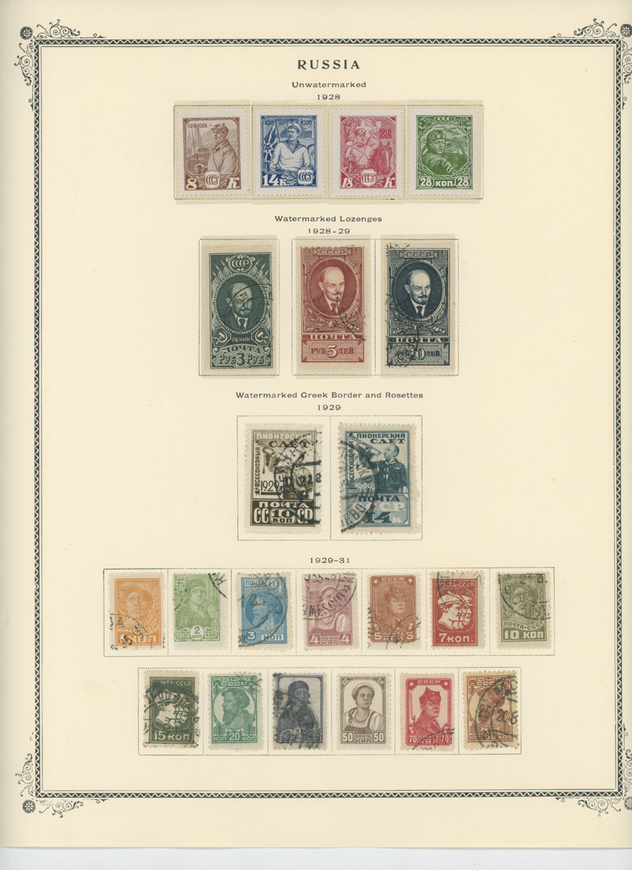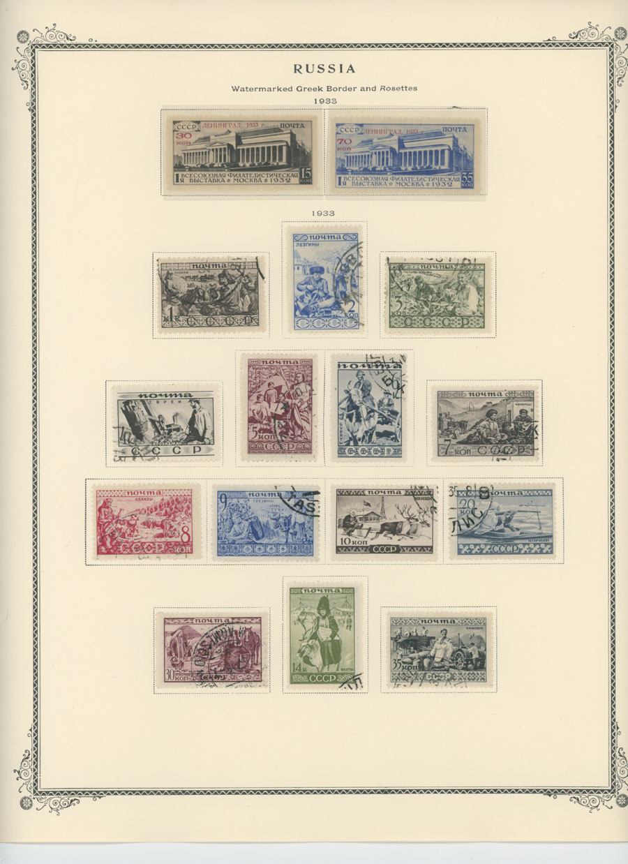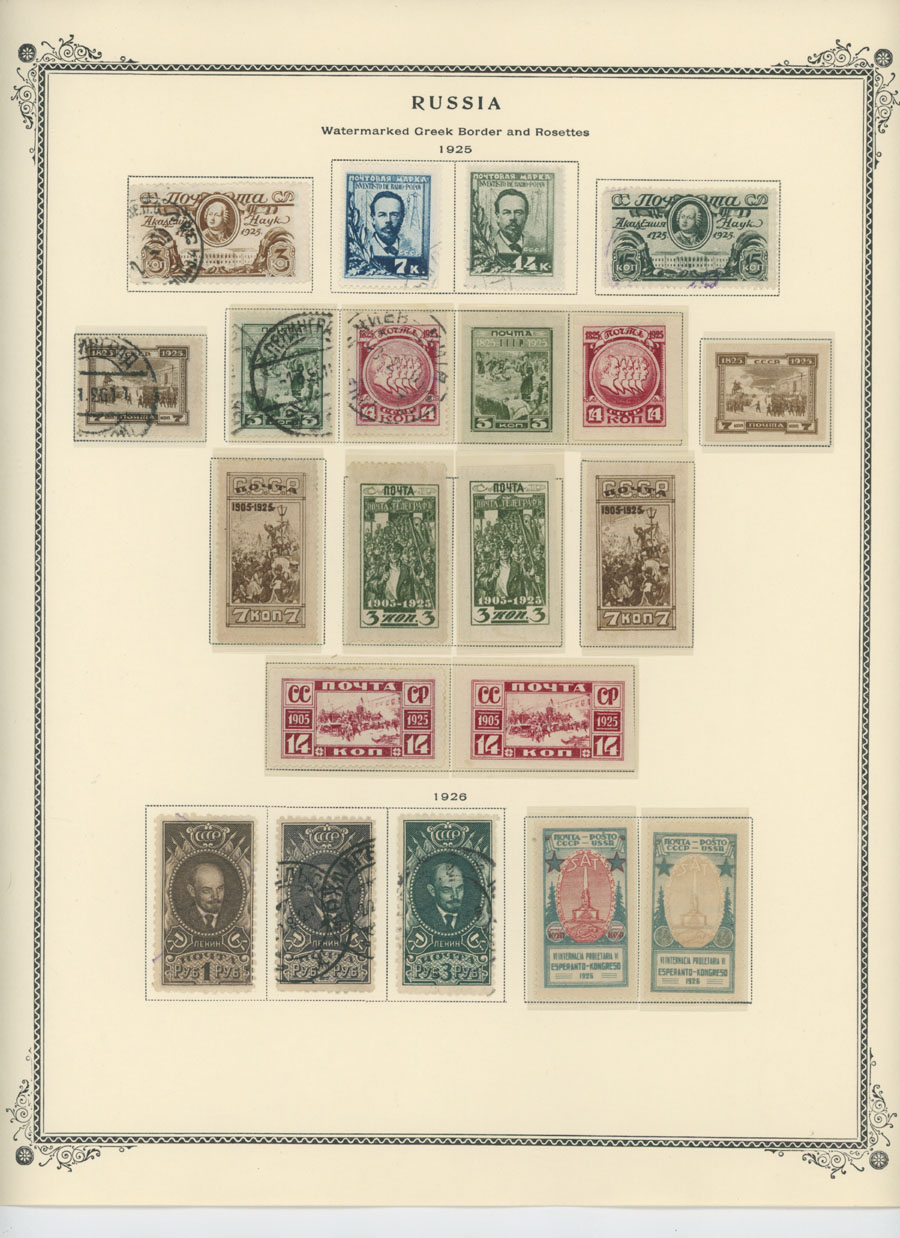 NEAT COLLECTION ON SCOTT ALBUM PAGES: 1923-64, about 2400 mint and used stamps and 33 souvenir sheets, starting with imperf and perf Agriculture Exhibition of 1923, very well completed unit, highlights of mint issues included 1st definitive imperf set on watermarked paper, 15th Anniversary of Revolution, Leningrad Exhibition, Lenin Mausoleum and Mendeleev sets, Stalin and Lenin souvenir sheets of 1949 and many more, full/part of OG or CTO with OG, F/VF, C.v. is $10,000, Est. $1,500-$2,000