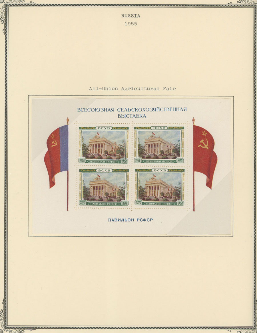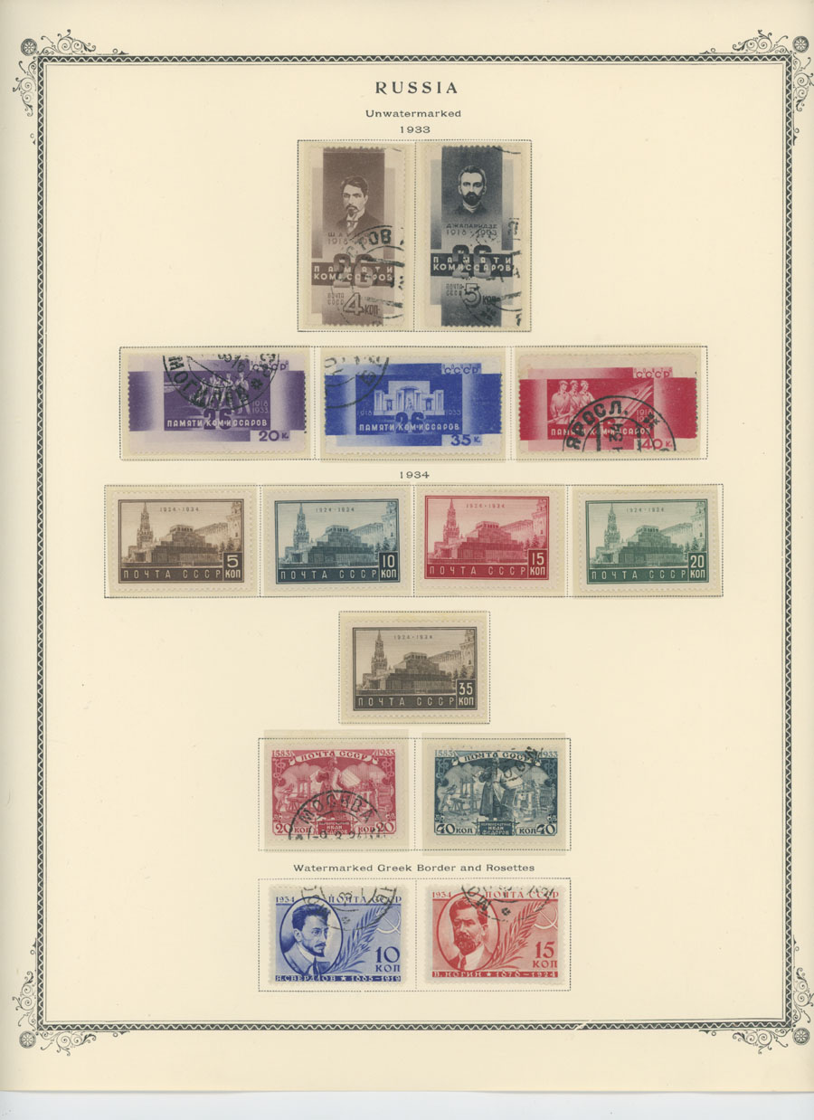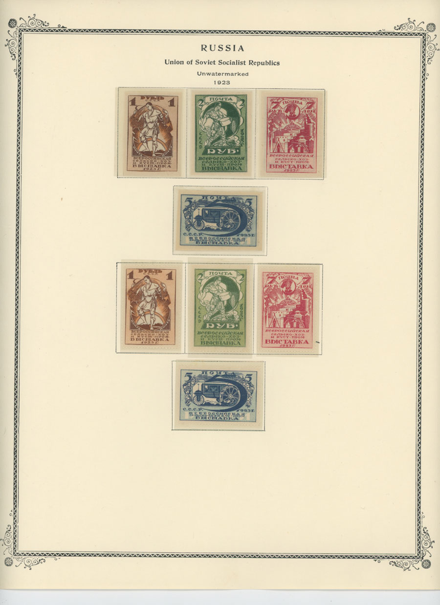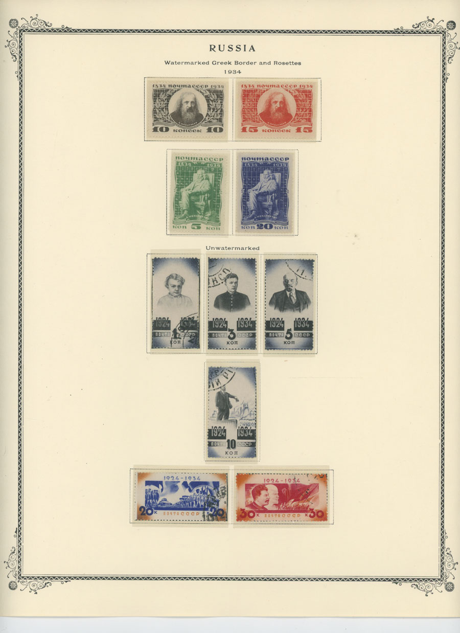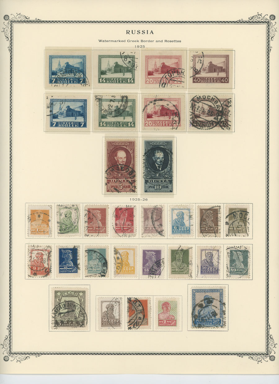 NEAT COLLECTION ON SCOTT ALBUM PAGES: 1923-64, about 2400 mint and used stamps and 33 souvenir sheets, starting with imperf and perf Agriculture Exhibition of 1923, very well completed unit, highlights of mint issues included 1st definitive imperf set on watermarked paper, 15th Anniversary of Revolution, Leningrad Exhibition, Lenin Mausoleum and Mendeleev sets, Stalin and Lenin souvenir sheets of 1949 and many more, full/part of OG or CTO with OG, F/VF, C.v. is $10,000, Est. $1,500-$2,000