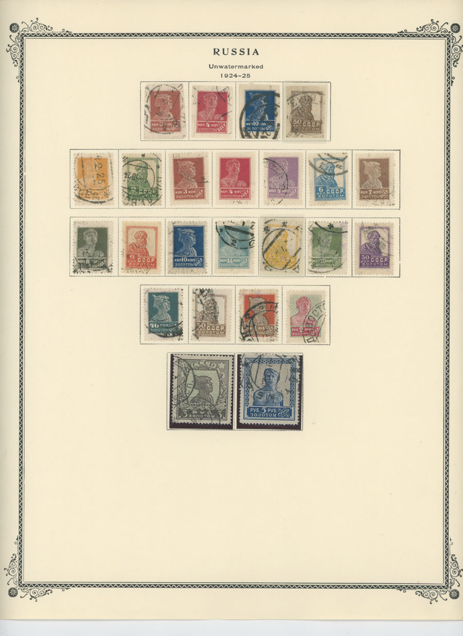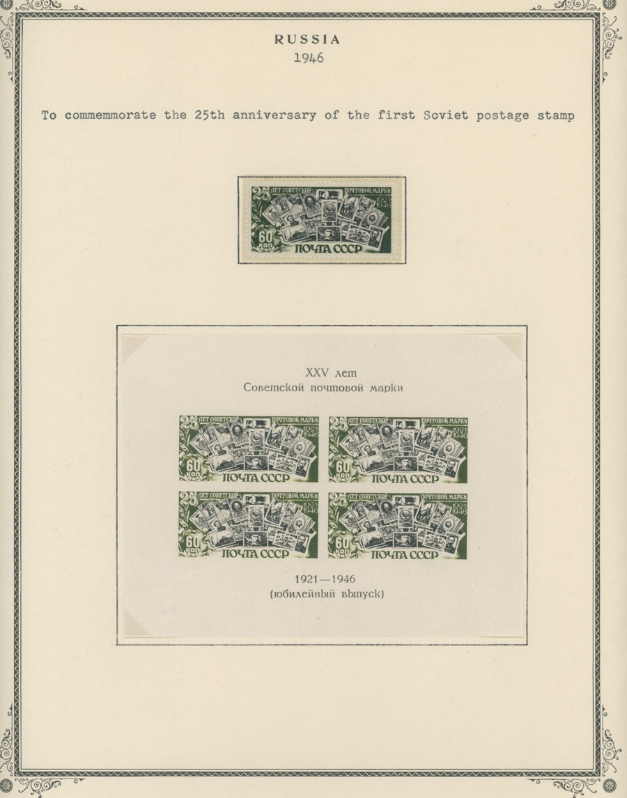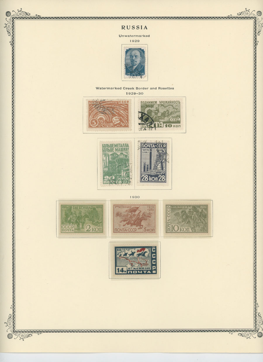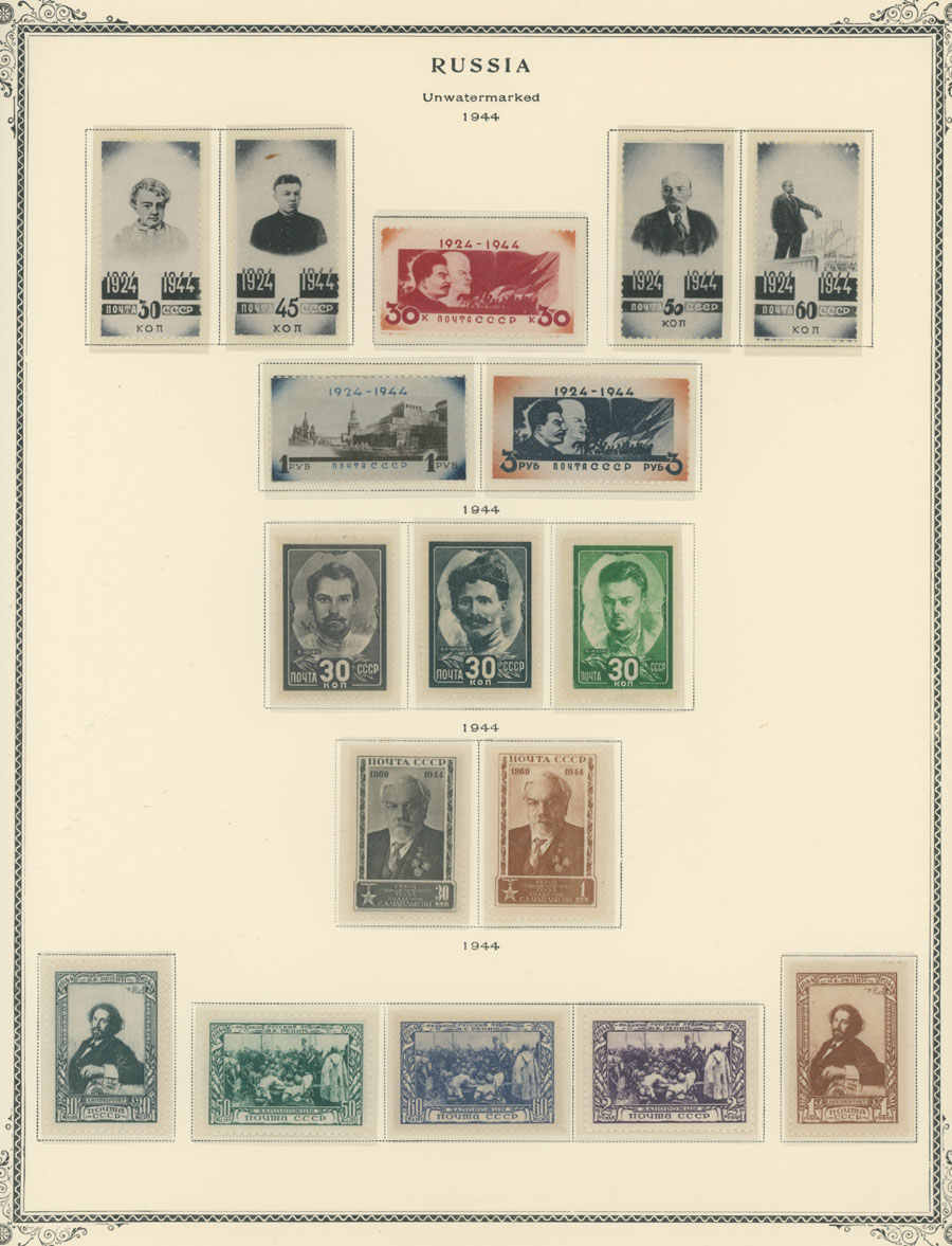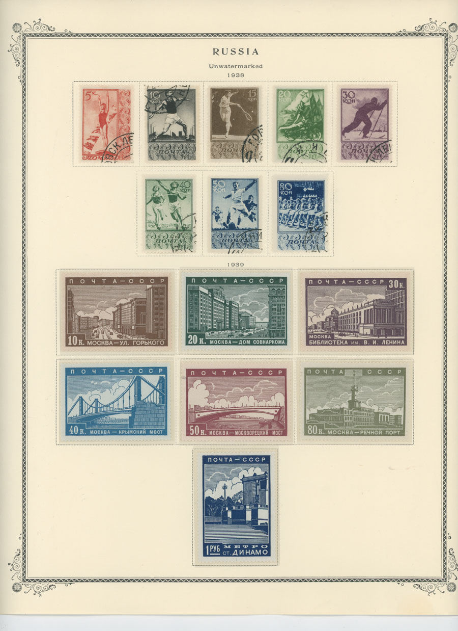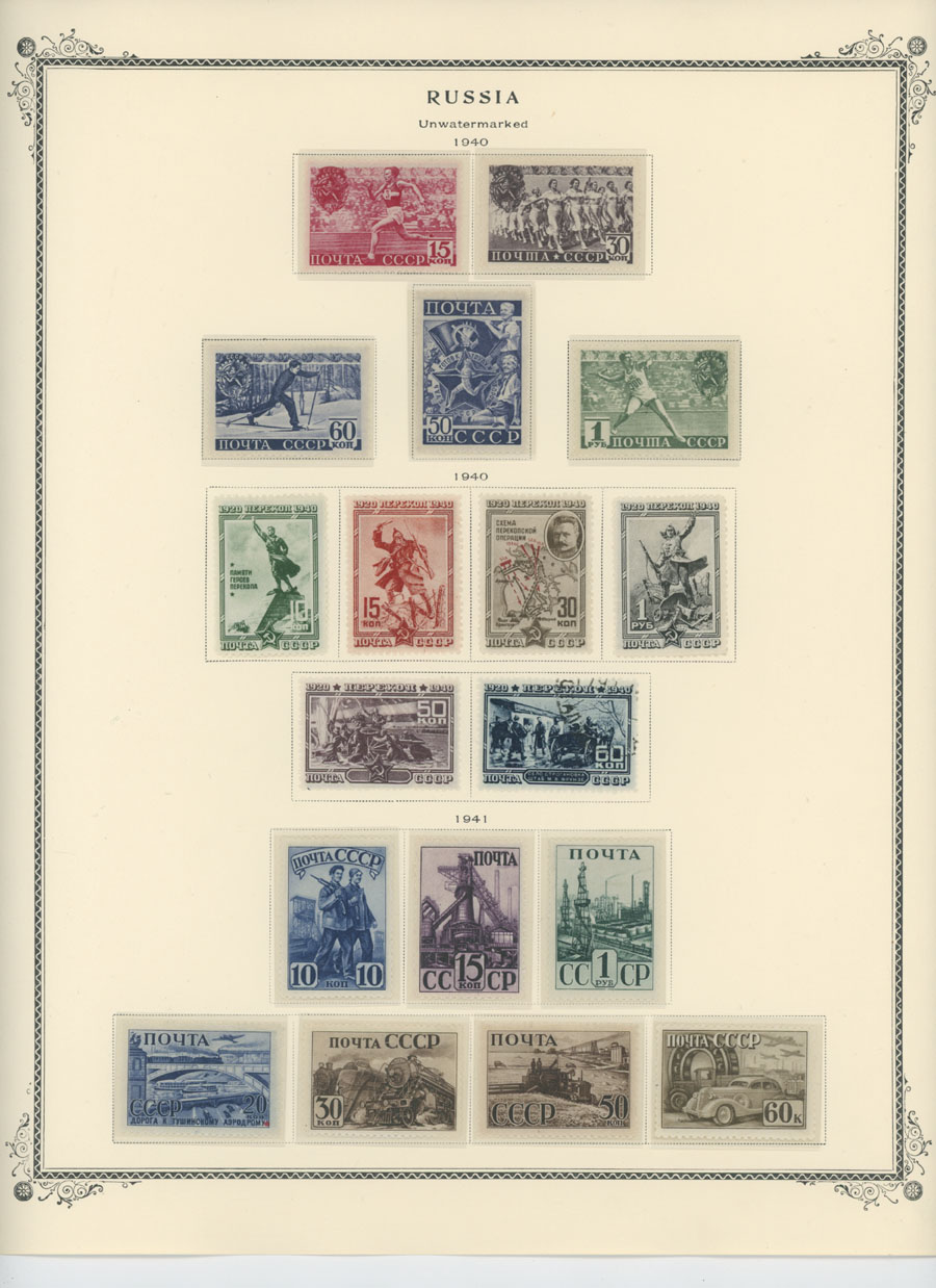 NEAT COLLECTION ON SCOTT ALBUM PAGES: 1923-64, about 2400 mint and used stamps and 33 souvenir sheets, starting with imperf and perf Agriculture Exhibition of 1923, very well completed unit, highlights of mint issues included 1st definitive imperf set on watermarked paper, 15th Anniversary of Revolution, Leningrad Exhibition, Lenin Mausoleum and Mendeleev sets, Stalin and Lenin souvenir sheets of 1949 and many more, full/part of OG or CTO with OG, F/VF, C.v. is $10,000, Est. $1,500-$2,000