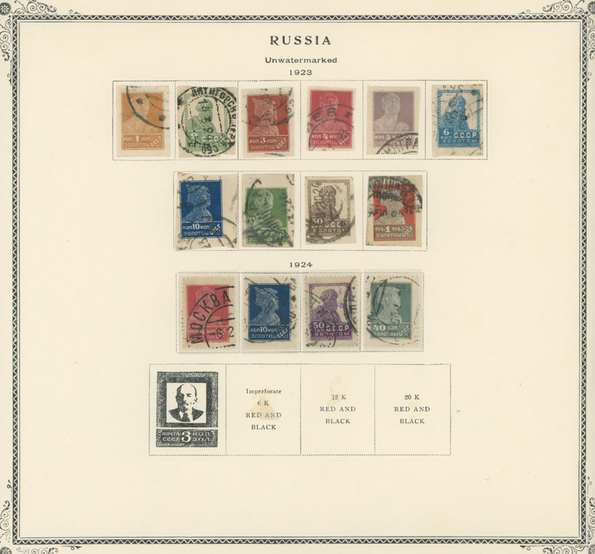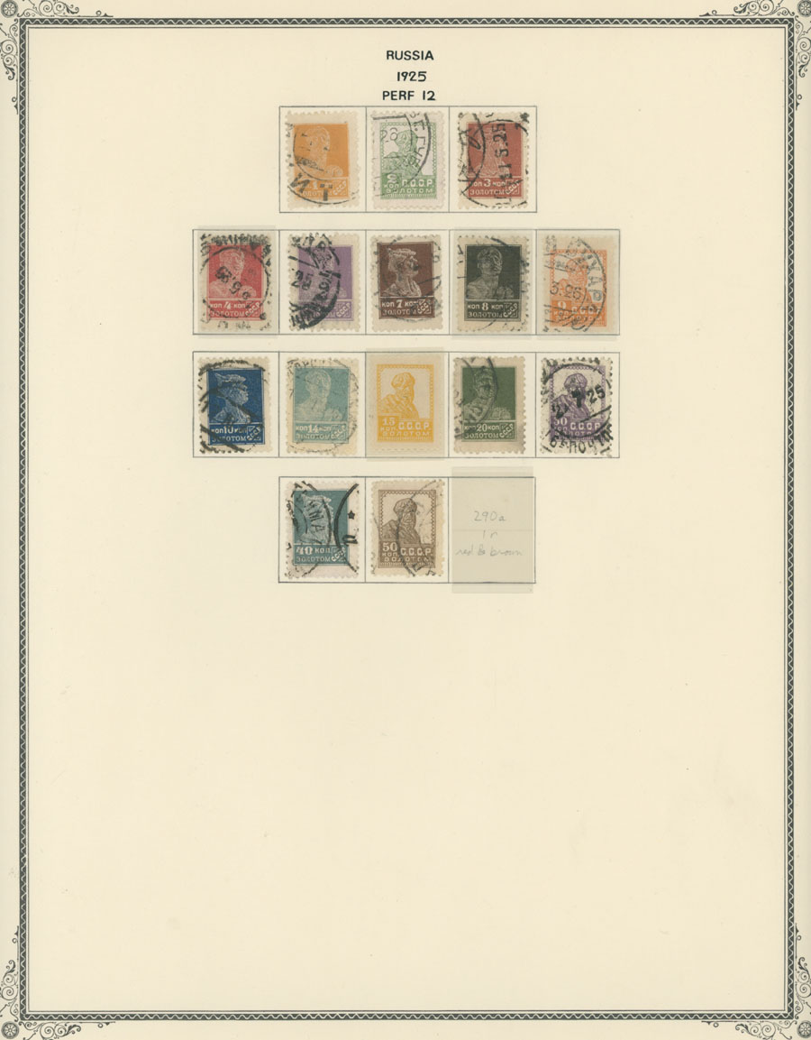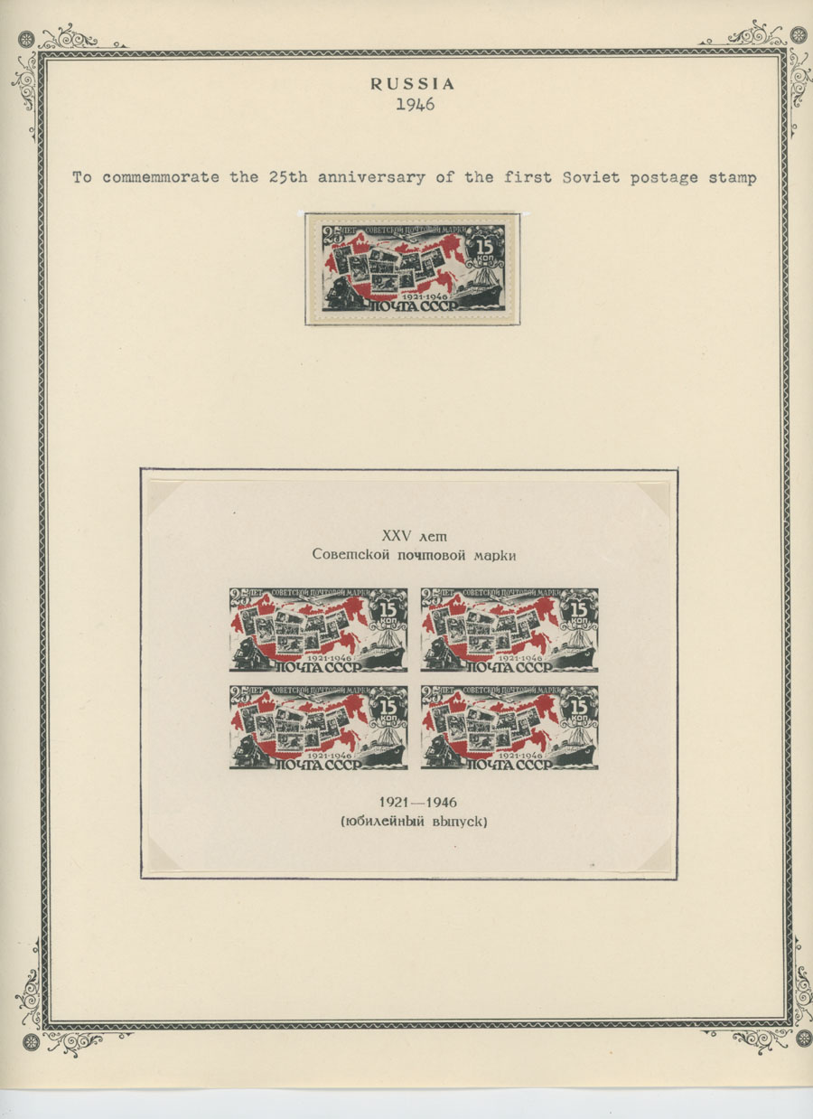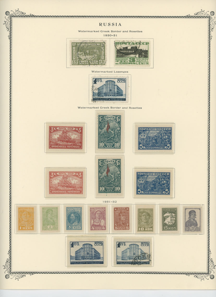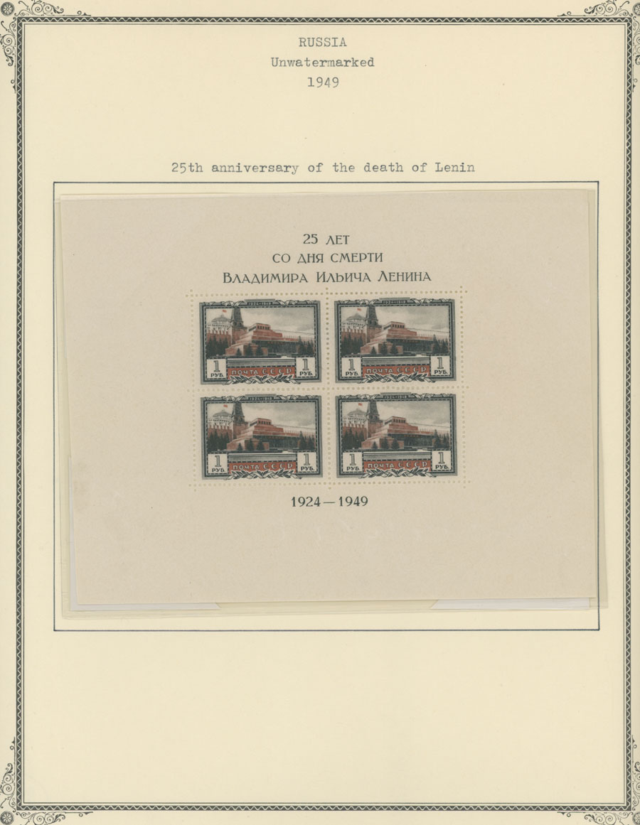 NEAT COLLECTION ON SCOTT ALBUM PAGES: 1923-64, about 2400 mint and used stamps and 33 souvenir sheets, starting with imperf and perf Agriculture Exhibition of 1923, very well completed unit, highlights of mint issues included 1st definitive imperf set on watermarked paper, 15th Anniversary of Revolution, Leningrad Exhibition, Lenin Mausoleum and Mendeleev sets, Stalin and Lenin souvenir sheets of 1949 and many more, full/part of OG or CTO with OG, F/VF, C.v. is $10,000, Est. $1,500-$2,000