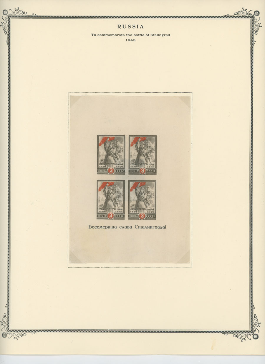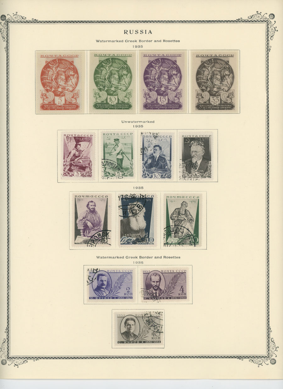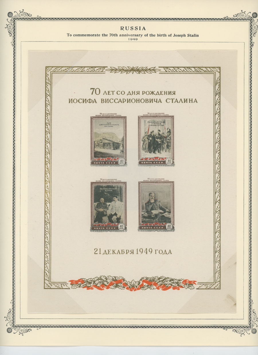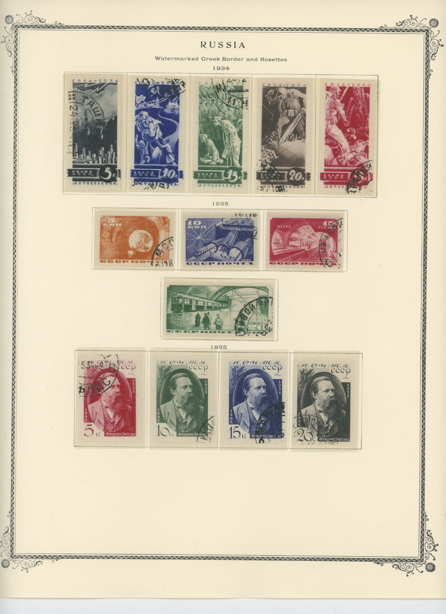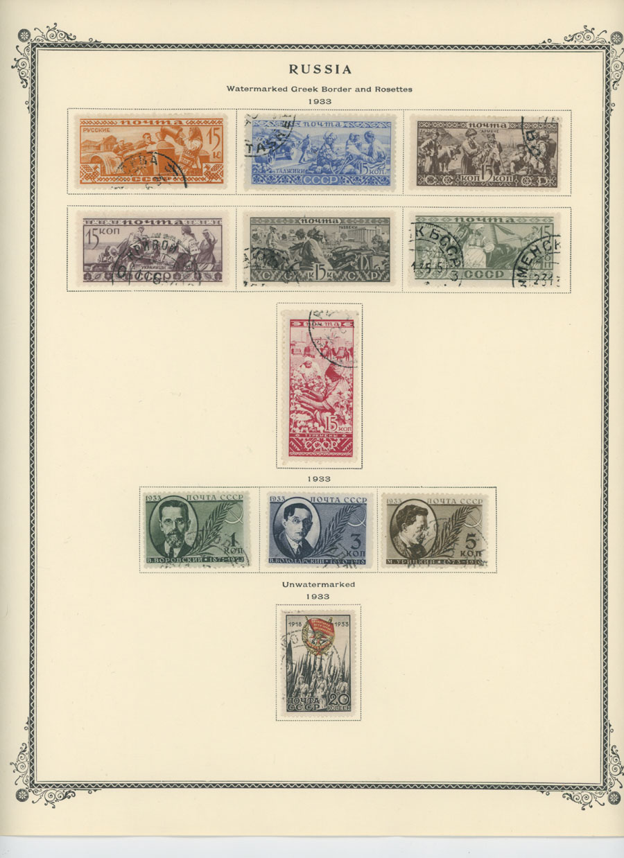 NEAT COLLECTION ON SCOTT ALBUM PAGES: 1923-64, about 2400 mint and used stamps and 33 souvenir sheets, starting with imperf and perf Agriculture Exhibition of 1923, very well completed unit, highlights of mint issues included 1st definitive imperf set on watermarked paper, 15th Anniversary of Revolution, Leningrad Exhibition, Lenin Mausoleum and Mendeleev sets, Stalin and Lenin souvenir sheets of 1949 and many more, full/part of OG or CTO with OG, F/VF, C.v. is $10,000, Est. $1,500-$2,000