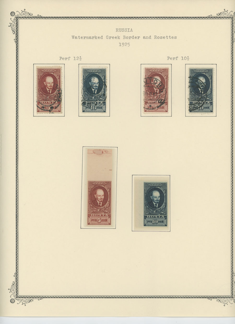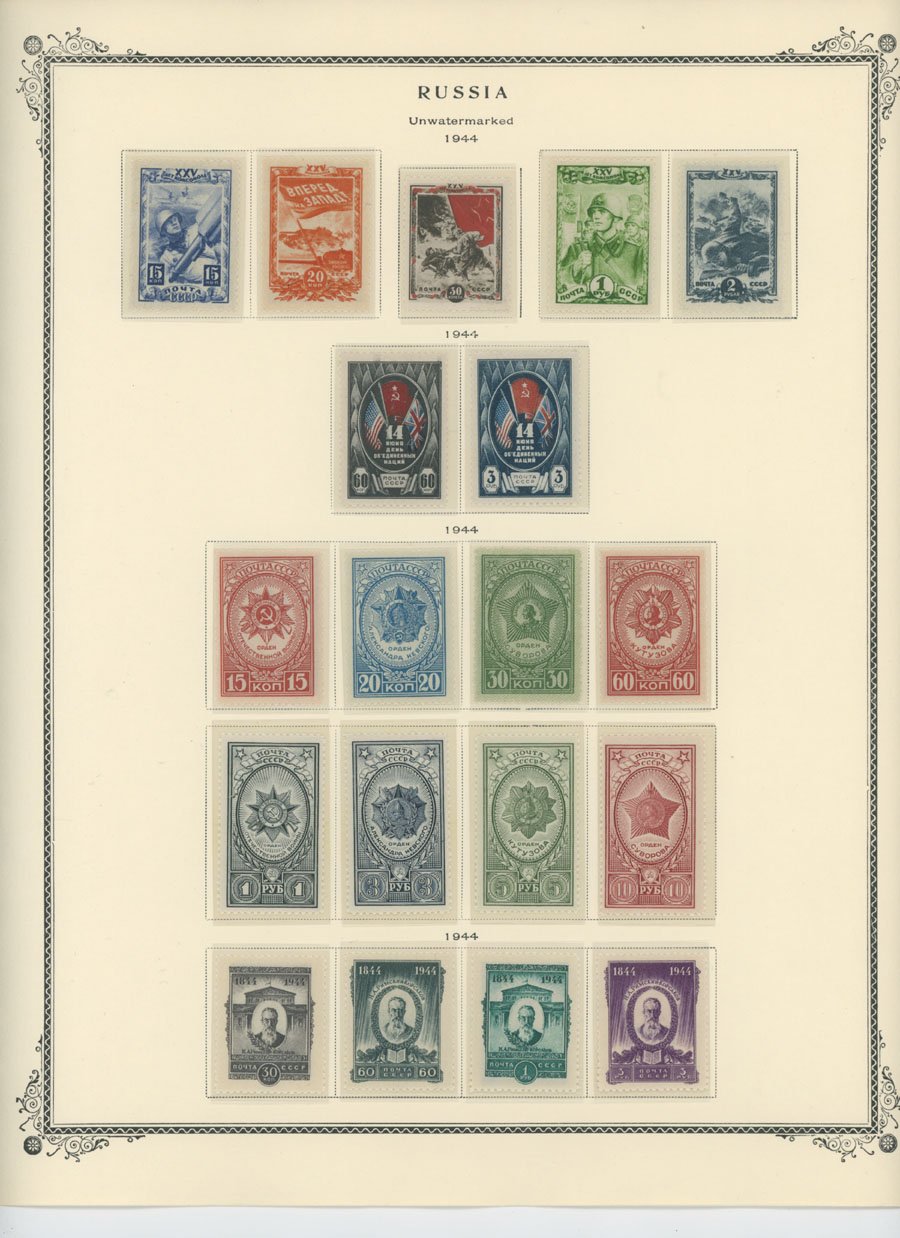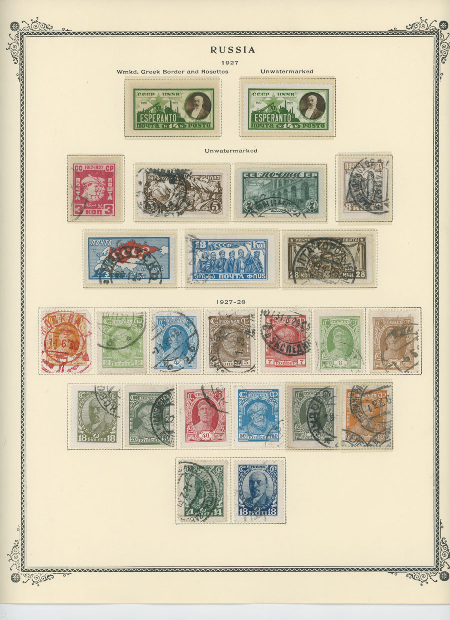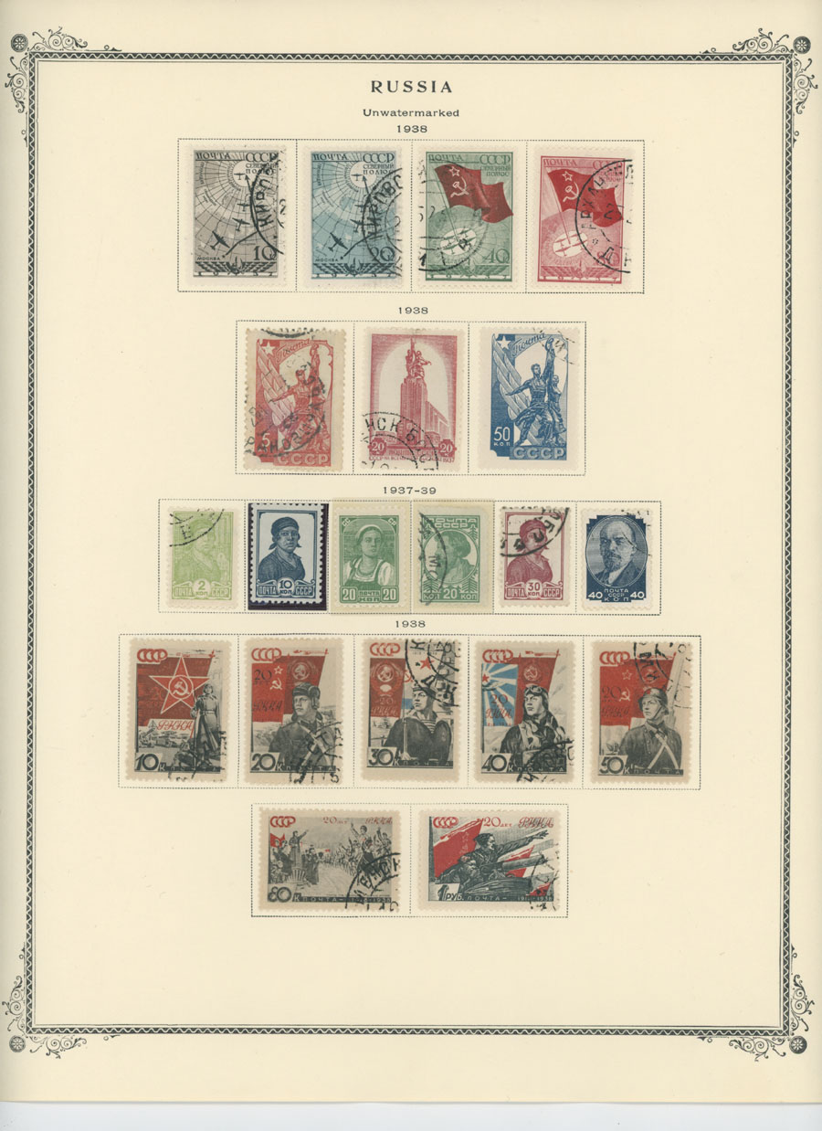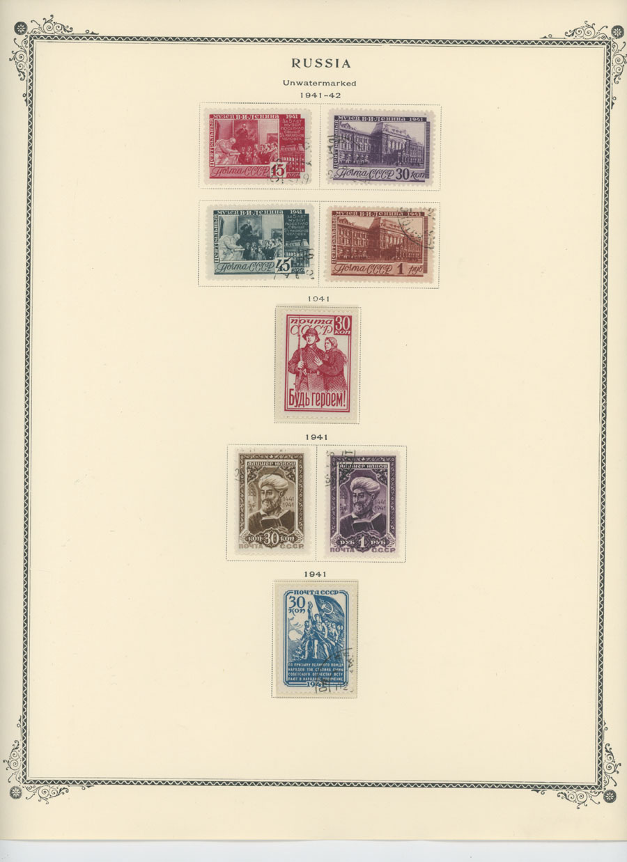 NEAT COLLECTION ON SCOTT ALBUM PAGES: 1923-64, about 2400 mint and used stamps and 33 souvenir sheets, starting with imperf and perf Agriculture Exhibition of 1923, very well completed unit, highlights of mint issues included 1st definitive imperf set on watermarked paper, 15th Anniversary of Revolution, Leningrad Exhibition, Lenin Mausoleum and Mendeleev sets, Stalin and Lenin souvenir sheets of 1949 and many more, full/part of OG or CTO with OG, F/VF, C.v. is $10,000, Est. $1,500-$2,000