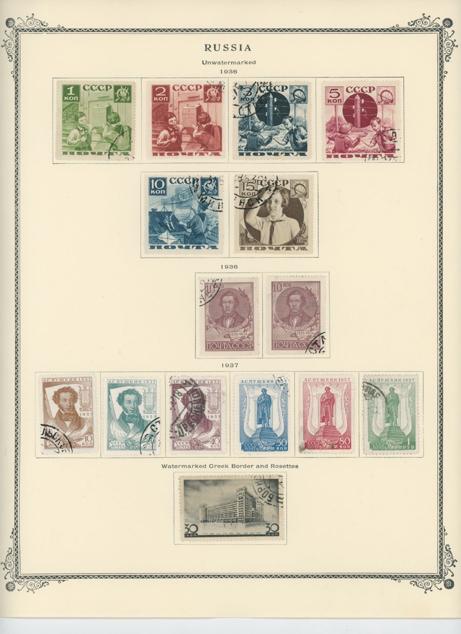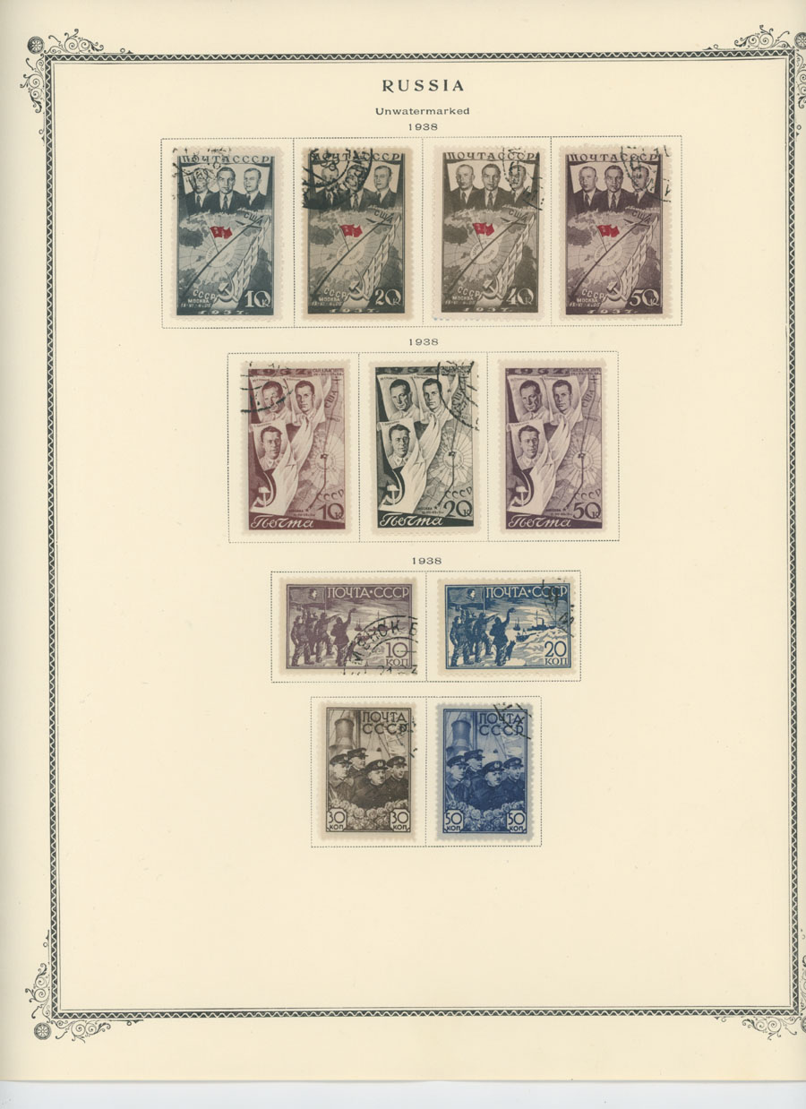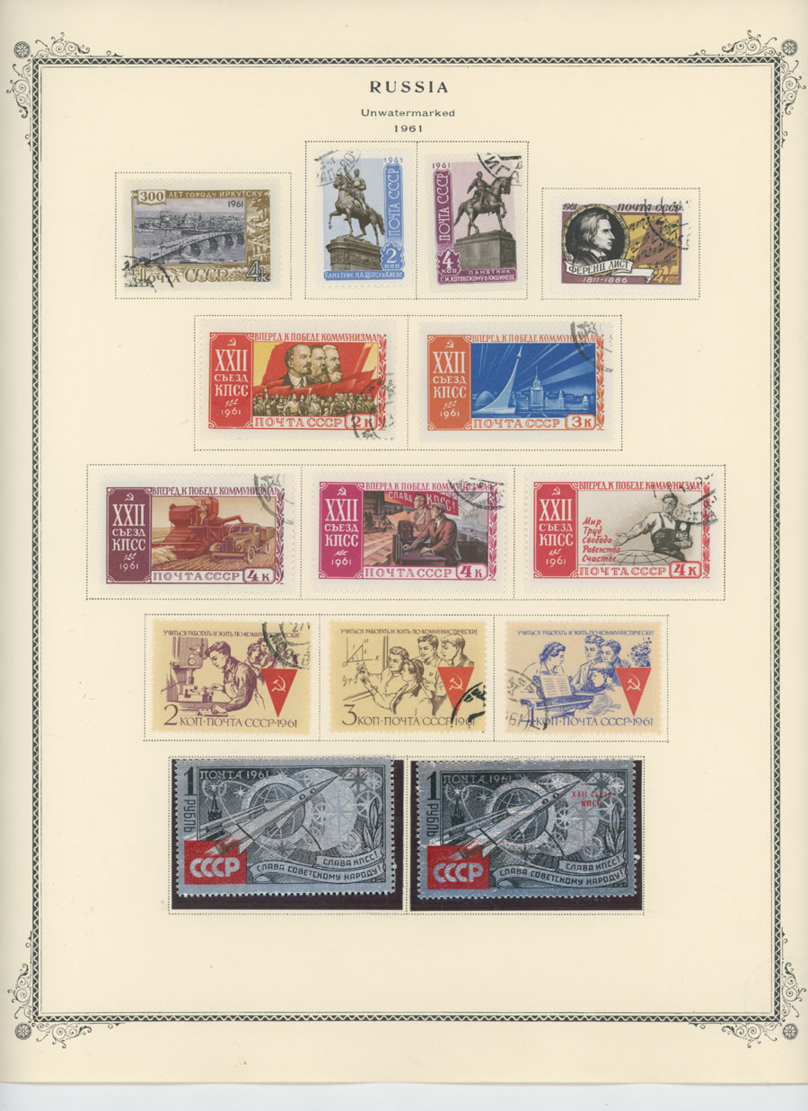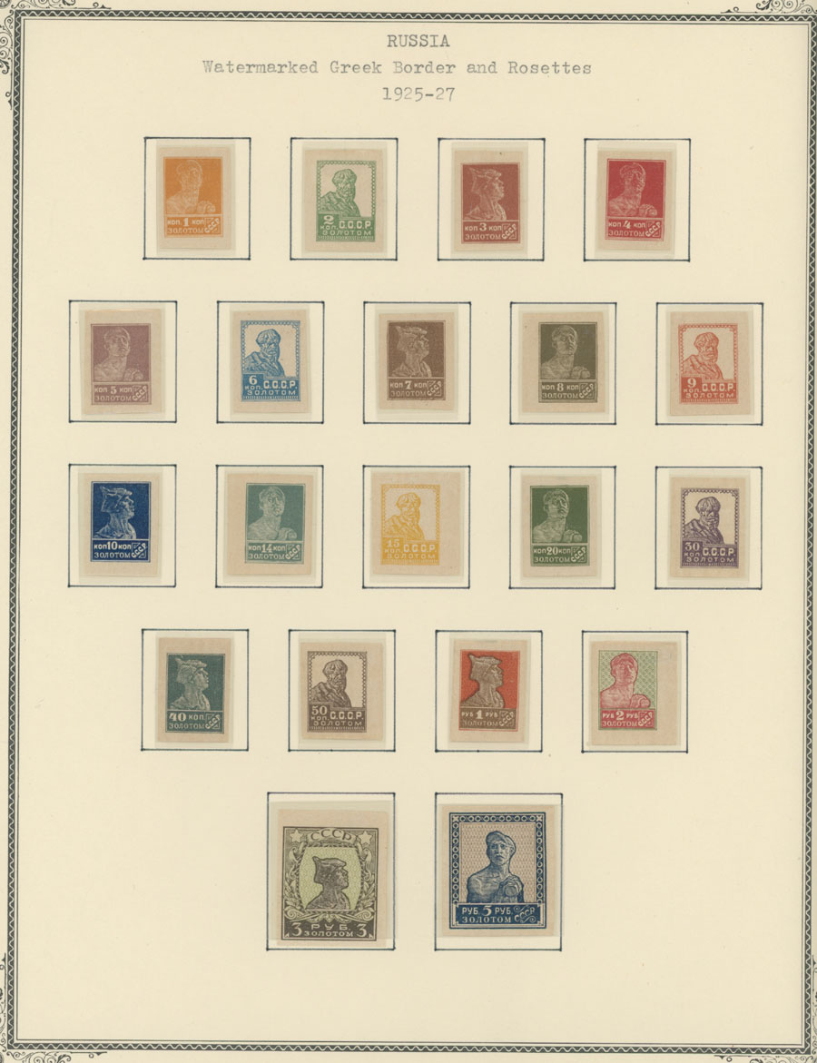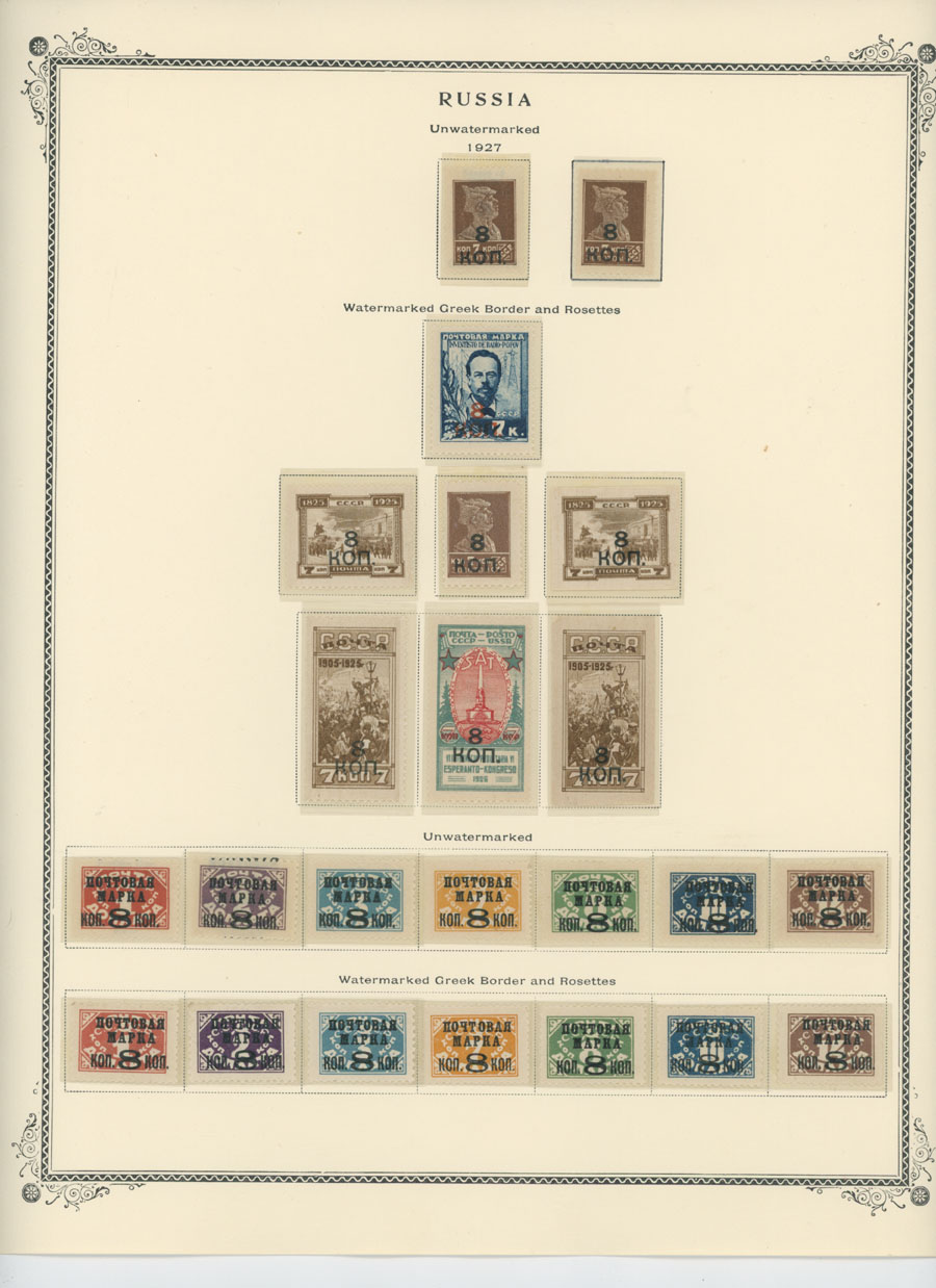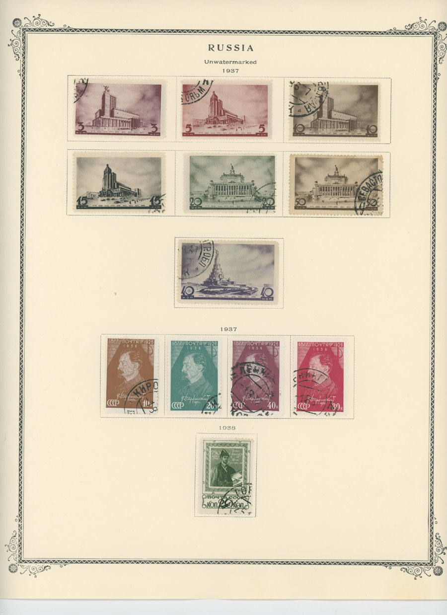 NEAT COLLECTION ON SCOTT ALBUM PAGES: 1923-64, about 2400 mint and used stamps and 33 souvenir sheets, starting with imperf and perf Agriculture Exhibition of 1923, very well completed unit, highlights of mint issues included 1st definitive imperf set on watermarked paper, 15th Anniversary of Revolution, Leningrad Exhibition, Lenin Mausoleum and Mendeleev sets, Stalin and Lenin souvenir sheets of 1949 and many more, full/part of OG or CTO with OG, F/VF, C.v. is $10,000, Est. $1,500-$2,000