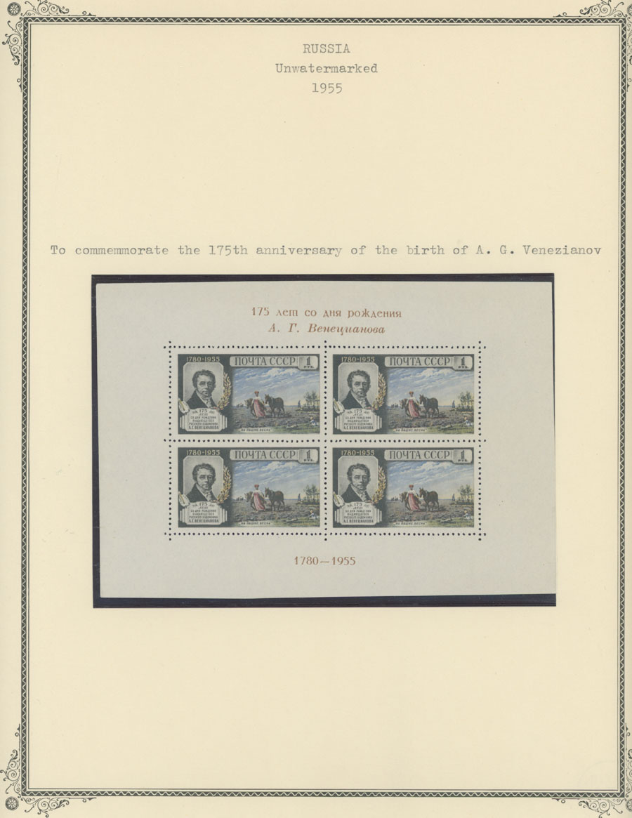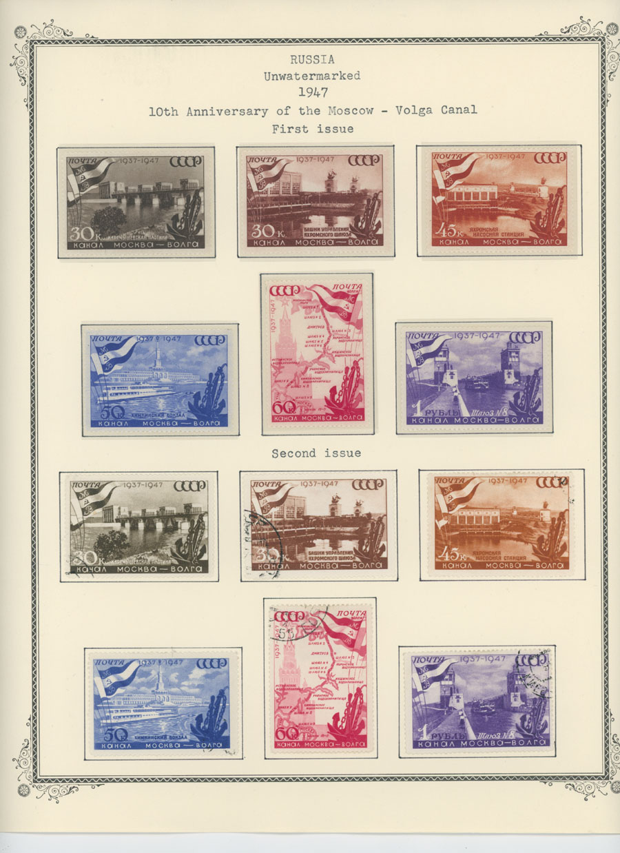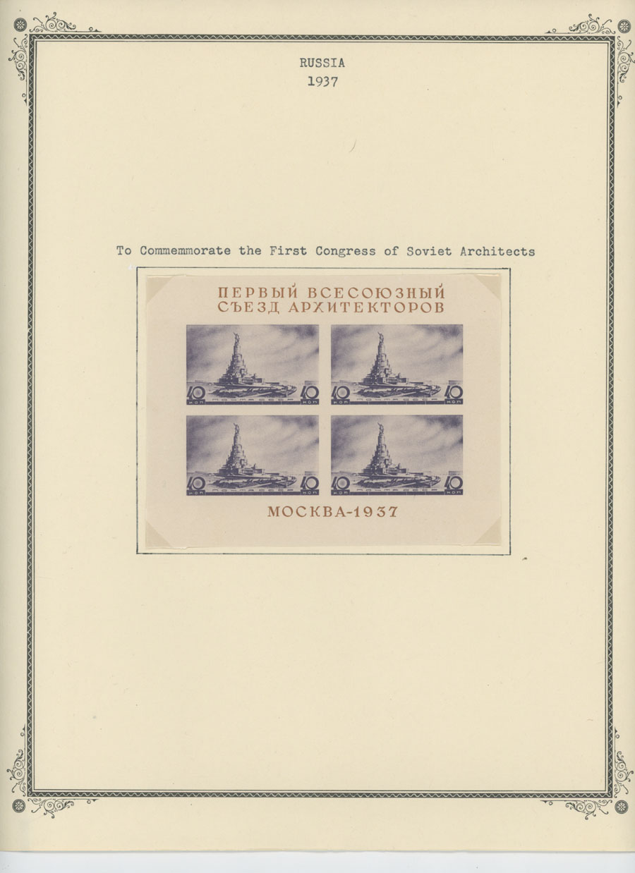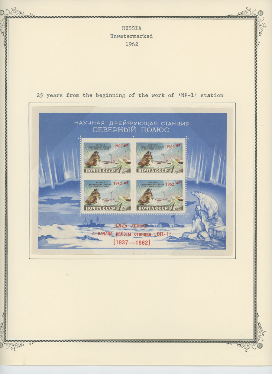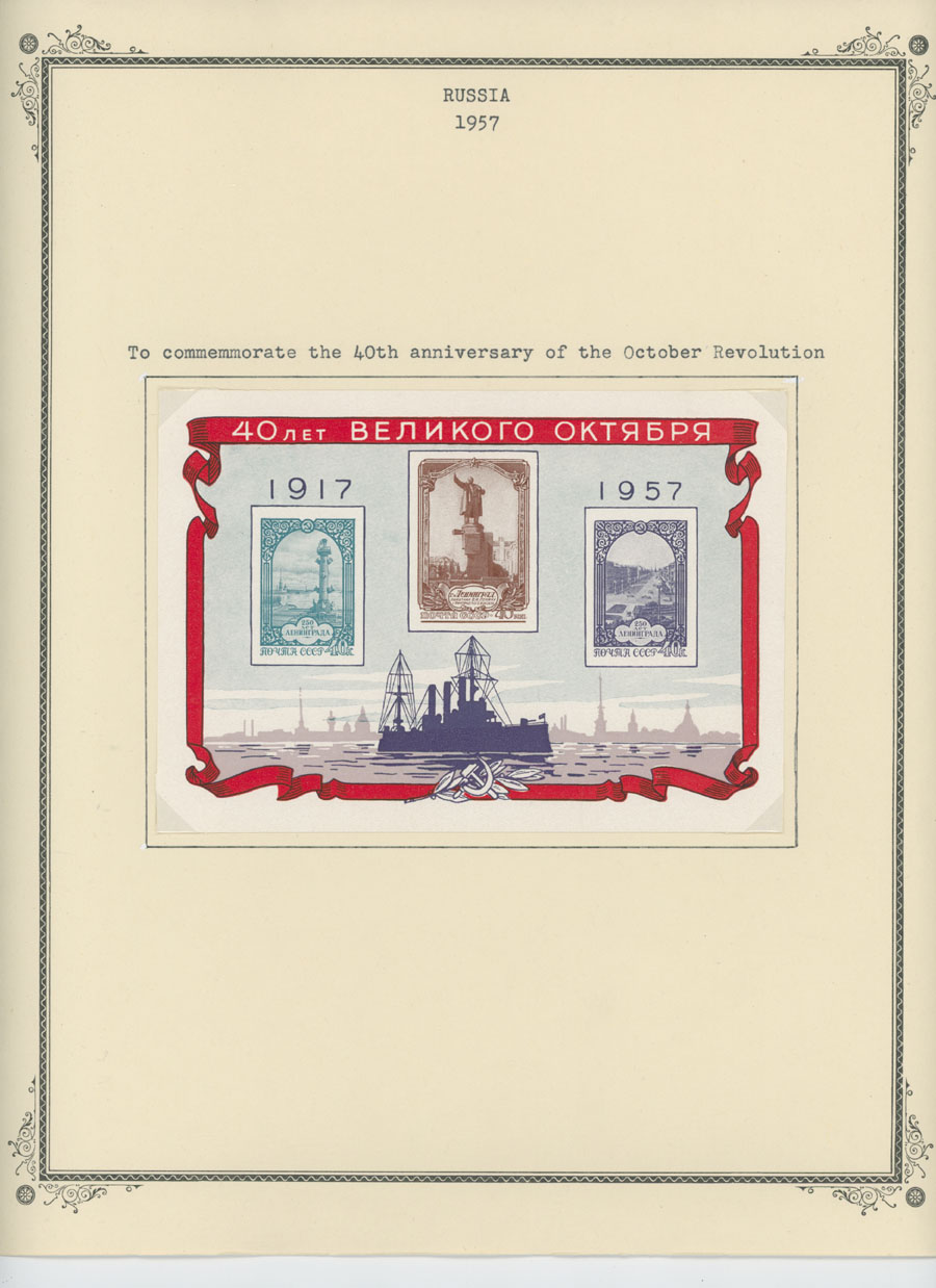 NEAT COLLECTION ON SCOTT ALBUM PAGES: 1923-64, about 2400 mint and used stamps and 33 souvenir sheets, starting with imperf and perf Agriculture Exhibition of 1923, very well completed unit, highlights of mint issues included 1st definitive imperf set on watermarked paper, 15th Anniversary of Revolution, Leningrad Exhibition, Lenin Mausoleum and Mendeleev sets, Stalin and Lenin souvenir sheets of 1949 and many more, full/part of OG or CTO with OG, F/VF, C.v. is $10,000, Est. $1,500-$2,000