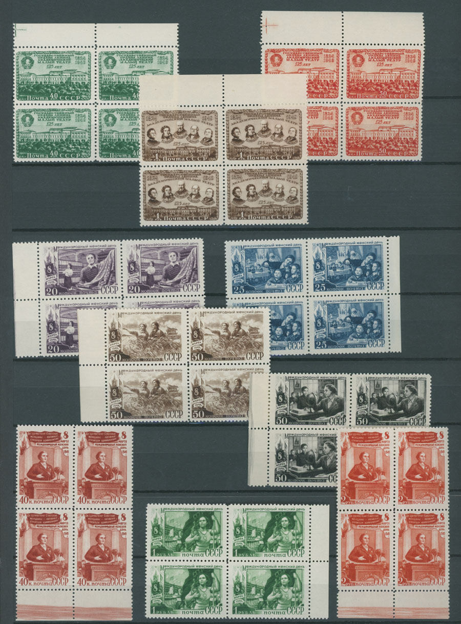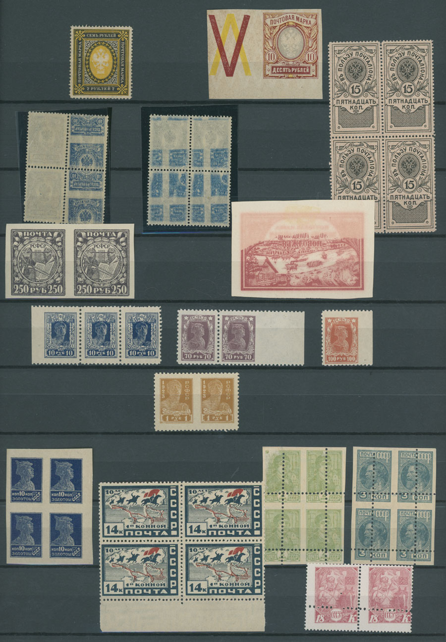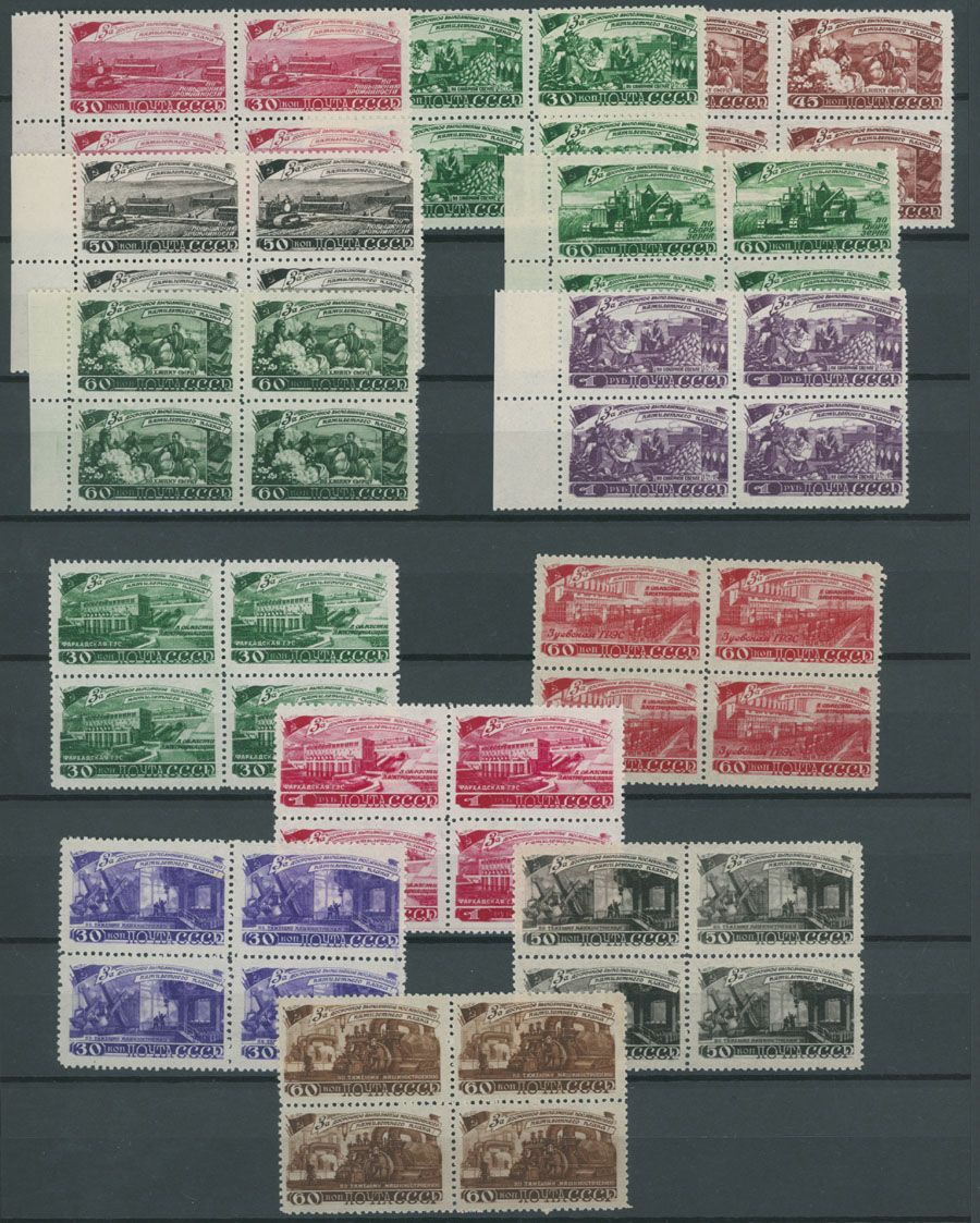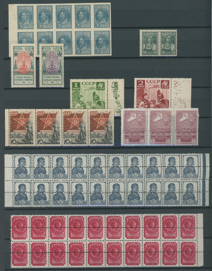 BEAUTIFUL PREMIUM QUALITY ASSORTMENT: 1905-58, about 500 mint stamps in singles, pairs, strips and blocks of 4, 6 or 20, starting with several Imperial, RSFSR and early Soviet regular and commemorative stamps, representing numerous printing and perforation errors, most catalog value is in multiples of 1940’s-50’s with total of 16 complete issues in blocks, in addition two ”key” stamps of Philately for the Children from the issue for collectors, both with L. Hovest certificates, nice condition, full OG, mainly NH, F/VF or better, great potential unit, C.v. is well over $5,500, Est. $1,600-$2,000, Scott #70/2140, B15/29