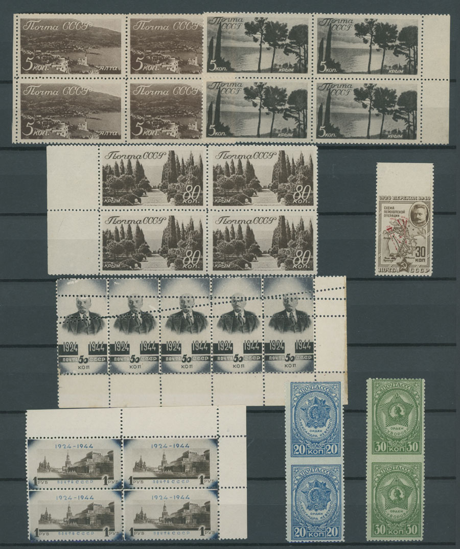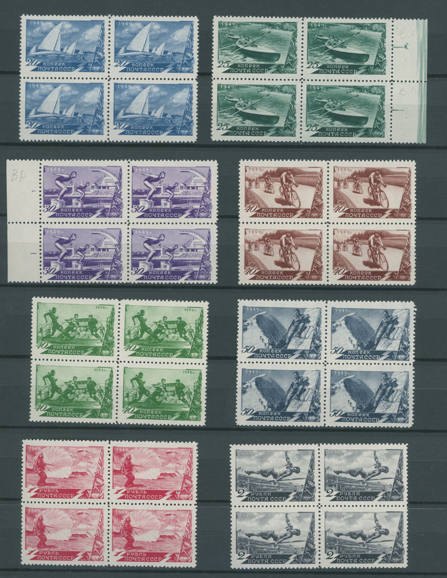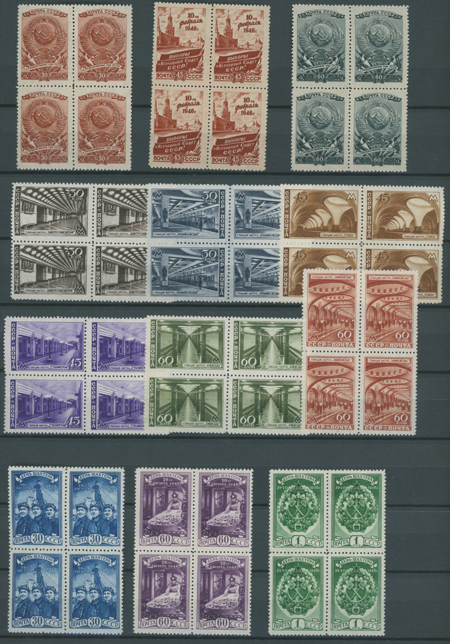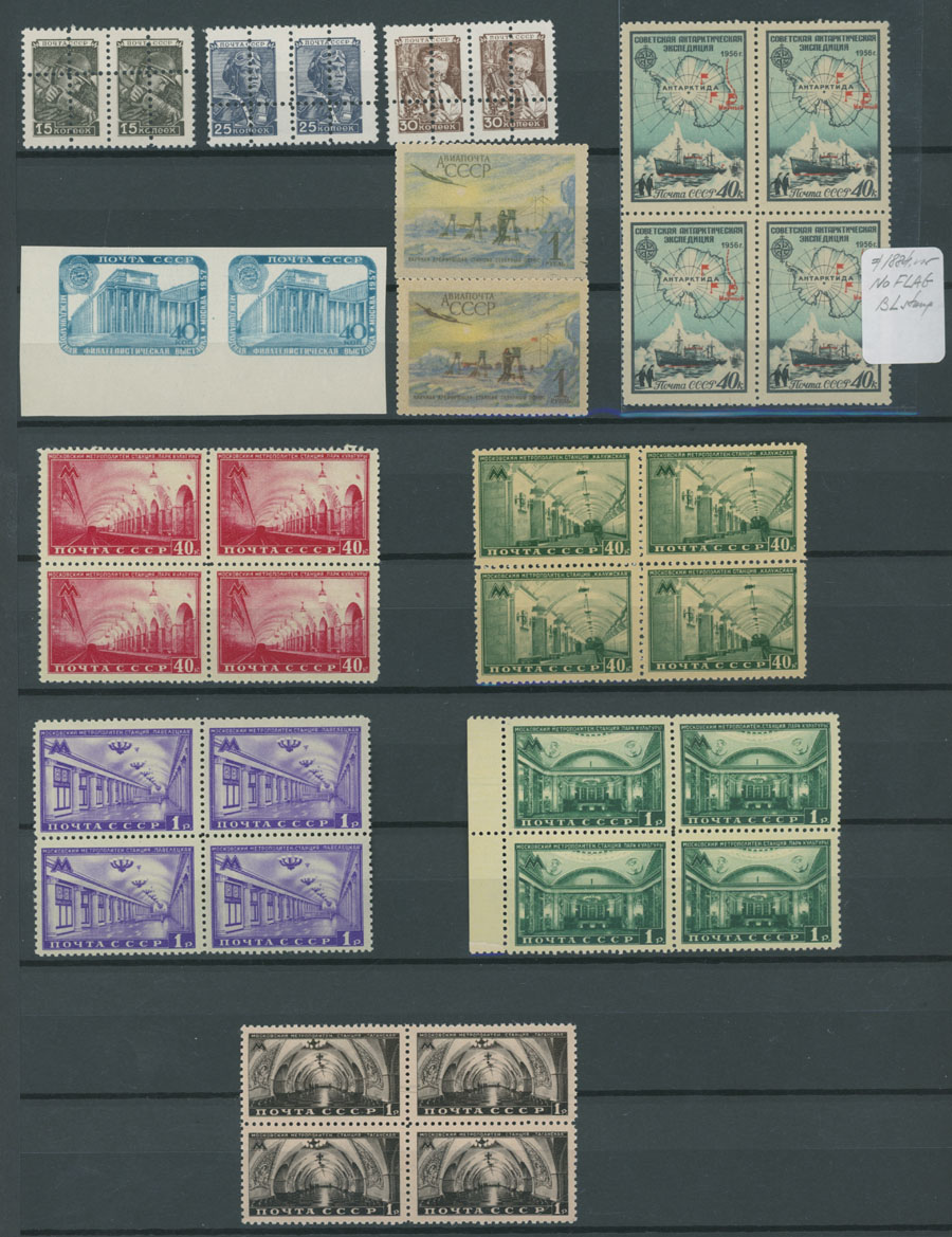 BEAUTIFUL PREMIUM QUALITY ASSORTMENT: 1905-58, about 500 mint stamps in singles, pairs, strips and blocks of 4, 6 or 20, starting with several Imperial, RSFSR and early Soviet regular and commemorative stamps, representing numerous printing and perforation errors, most catalog value is in multiples of 1940’s-50’s with total of 16 complete issues in blocks, in addition two ”key” stamps of Philately for the Children from the issue for collectors, both with L. Hovest certificates, nice condition, full OG, mainly NH, F/VF or better, great potential unit, C.v. is well over $5,500, Est. $1,600-$2,000, Scott #70/2140, B15/29
