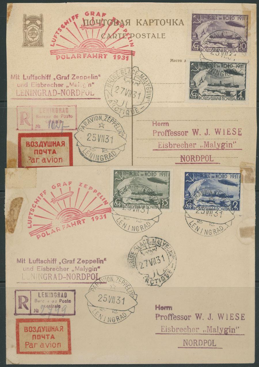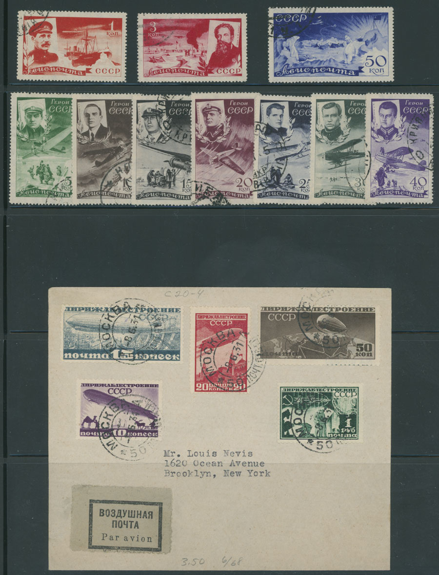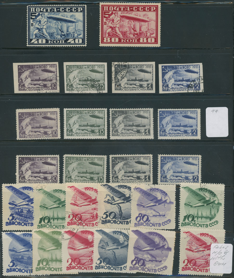 BALANCE OF A CONSIGNMENT: 1906-35, over 50 mint and used stamps, including 70r error in block of 9, imperf definitive set on white wove paper, two essays of Pioneer from 1926, Moscow Zeppelin issue, perf 12½, three Ice-Breaker ”Malygin” sets two mint (one NH) and one – used, Zeppelin North Pole Flight card and cover (some staining) and etc., in addition 12 fakes of Civil Aviation issue, fresh quality, full/large part of OG or used, F/VF, Est. $500-$600
