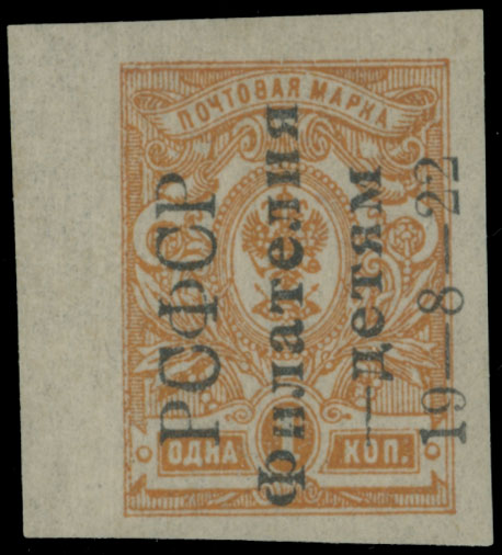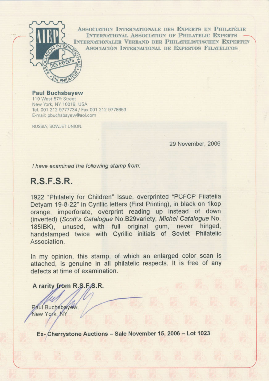 1922, Philately for the Children, black reading up (inverted) overprint on imperforate 1k orange, left margin single, overprint position 15 of the second not inverted setting, full OG, NH, VF, P. Buchsbayew certificate, Est. $750-$800 , Scott #B29a