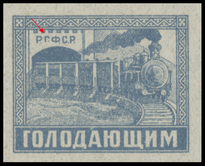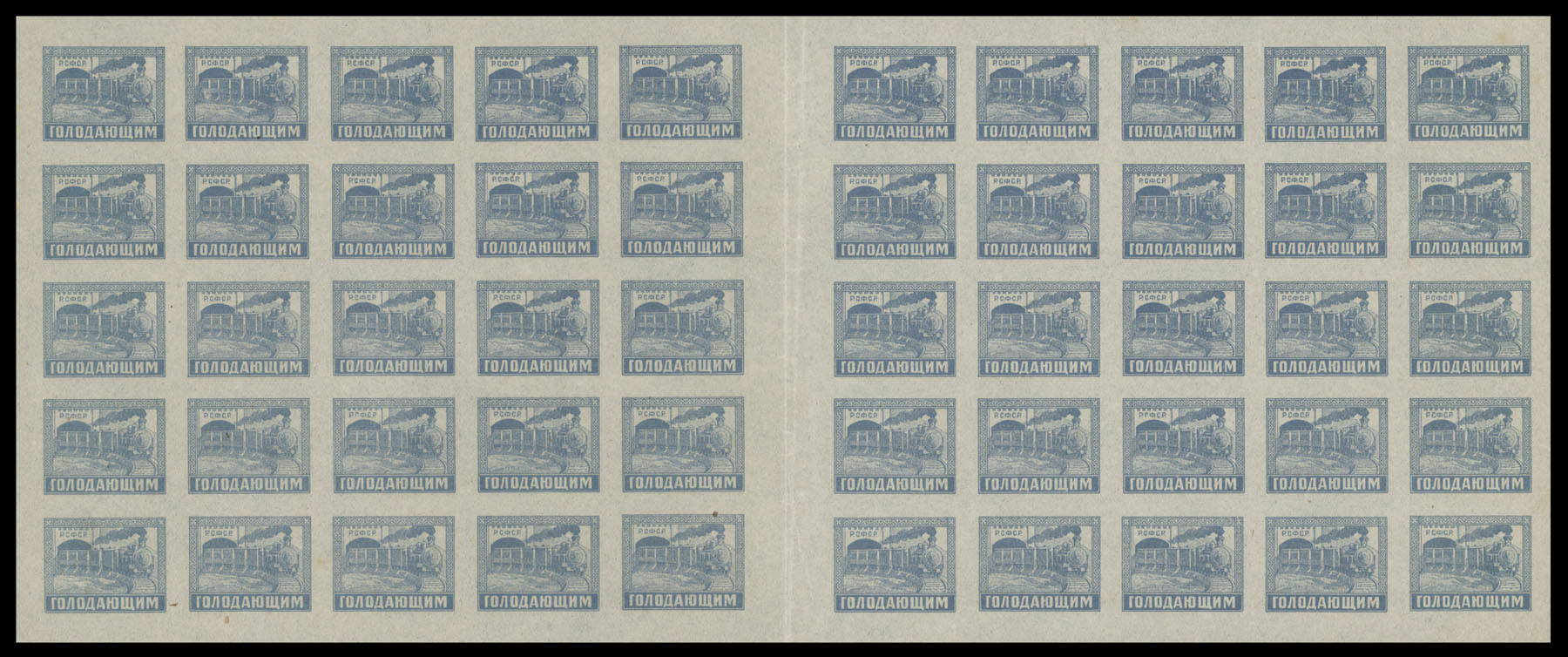 1922, Postal Train (20r+5r) gray blue, inscribed ”For the Hungry”, complete sheet of 50 containing two panes of 25, stamps on position 18 of each pane or positions 33 and 38 of complete sheet have ”R.G.F.S.R.” variety, light fold along the gutter between panes, full OG, NH, VF, Est. $150-$200, Scott #B36, var