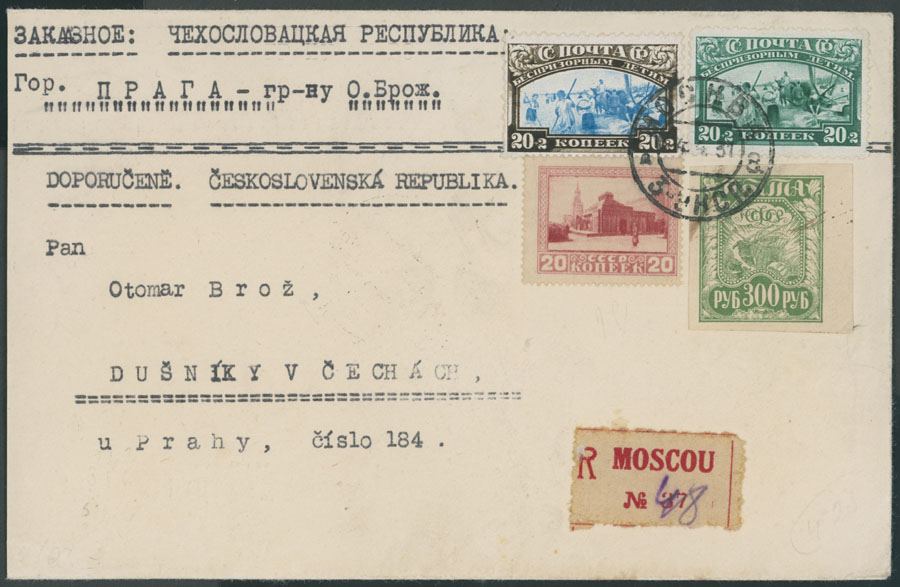 1931 (April 4), four stamps, including two Child Welfare semi-postal of 20+2k, Lenin Mausoleum of 20k and RSFSR (!) 300r green, used on registered cover from Moscow to Czechoslovakia, all stamps tied by Moscow cancel, however applying of 300r was not necessary (postal rate – 45k for such mailing at that time), arrival ds on reverse, traces of mounts, still F/VF and interesting cover, Est. $200-$250, Scott #B56-57