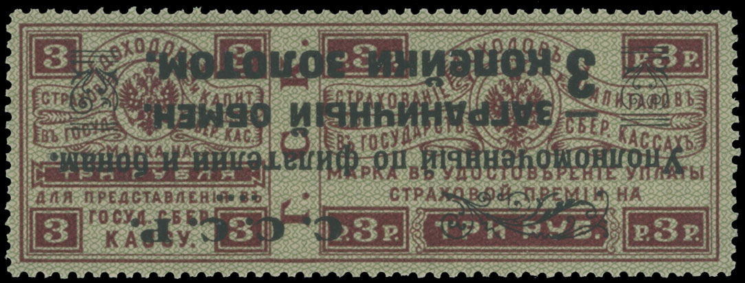 1923, 1st Soviet issue, inverted black surcharge (type I) 3k on Imperial insurance stamp of 3k brown lilac on green network, perforation 13½, full OG, NH, VF, Standard Cat. #PE 2Ta, Est. $200-$250