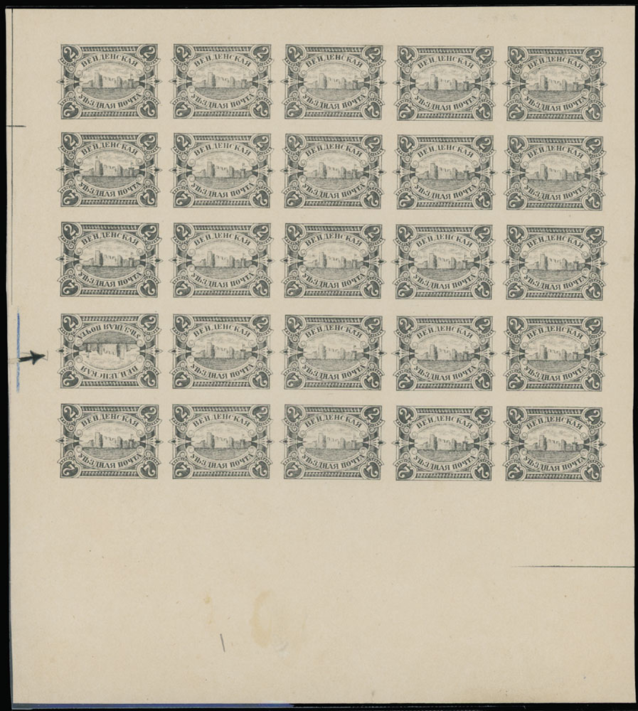 1901-03, Wenden Castle, imperforate proof of 2k in black, bottom sheet margin pane of 25 printed on wove paper, stamp on position 16 is placed upside down and forming either vertical or horizontal tete-beche pair, no gum as produced, hinge reminders at corners, VF and extremely rare, Kramarenko ”Russika” Cat. #14 P2 II, C.v. $12,500, Est. $5,000-$6,000, Scott #L12