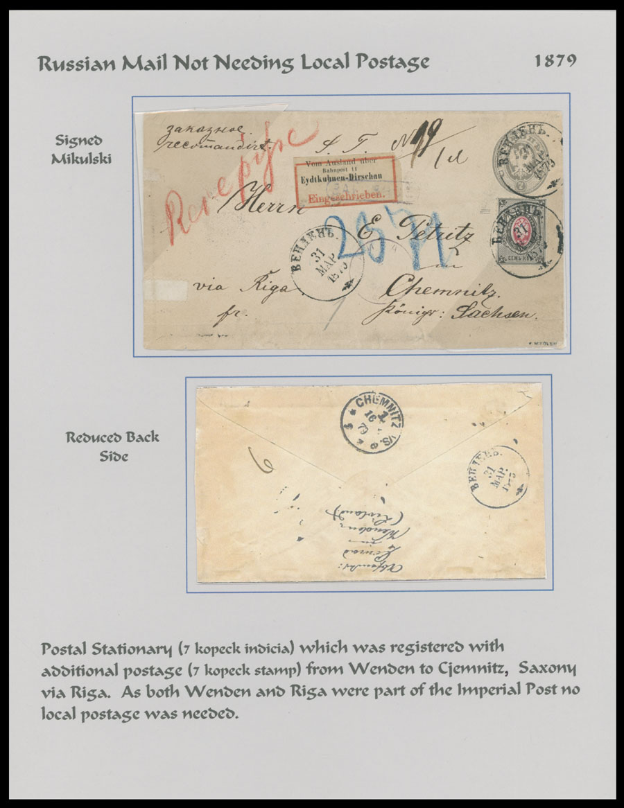 1879 (March 31), stationery envelope 7k gray, uprated by 7k gray and rose on horizontally laid paper, sent from Wenden to Germany, German TPO registration label, Chemnitz arrival marking on the back, F/VF, Z. Mikulski expert hs, arranged on page from the Collection, F/VF, Est. $200-$250, Scott #27