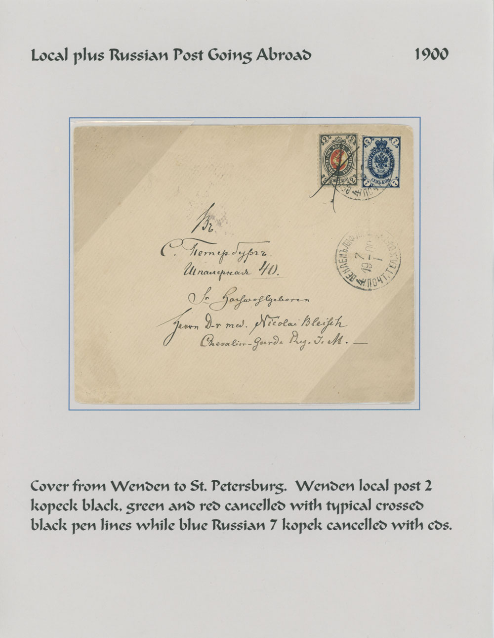 1900 (January 7), Imperial 7k blue together with Wenden Arms 2k used on cover addressed to St. Petersburg, both cancelled by appropriate date stamp and Wenden stamp in addition by pen cross, next day arrival marking is on reverse, arranged on page from the Collection, mostly VF, Est. $300-$400, Scott #L11