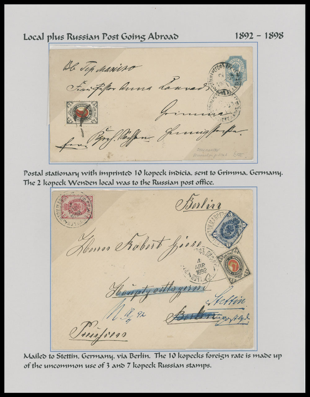 1892-95, two items on page from the Collection, cover to Berlin forwarded to Stettin franked by Imperial 3k and 7k plus Wenden Arms 2k; stationery envelope 10k blue uprated by Wenden stamp, addressed to Grimma, all appropriate markings, mostly VF, Est. $500-$600, Scott #L11