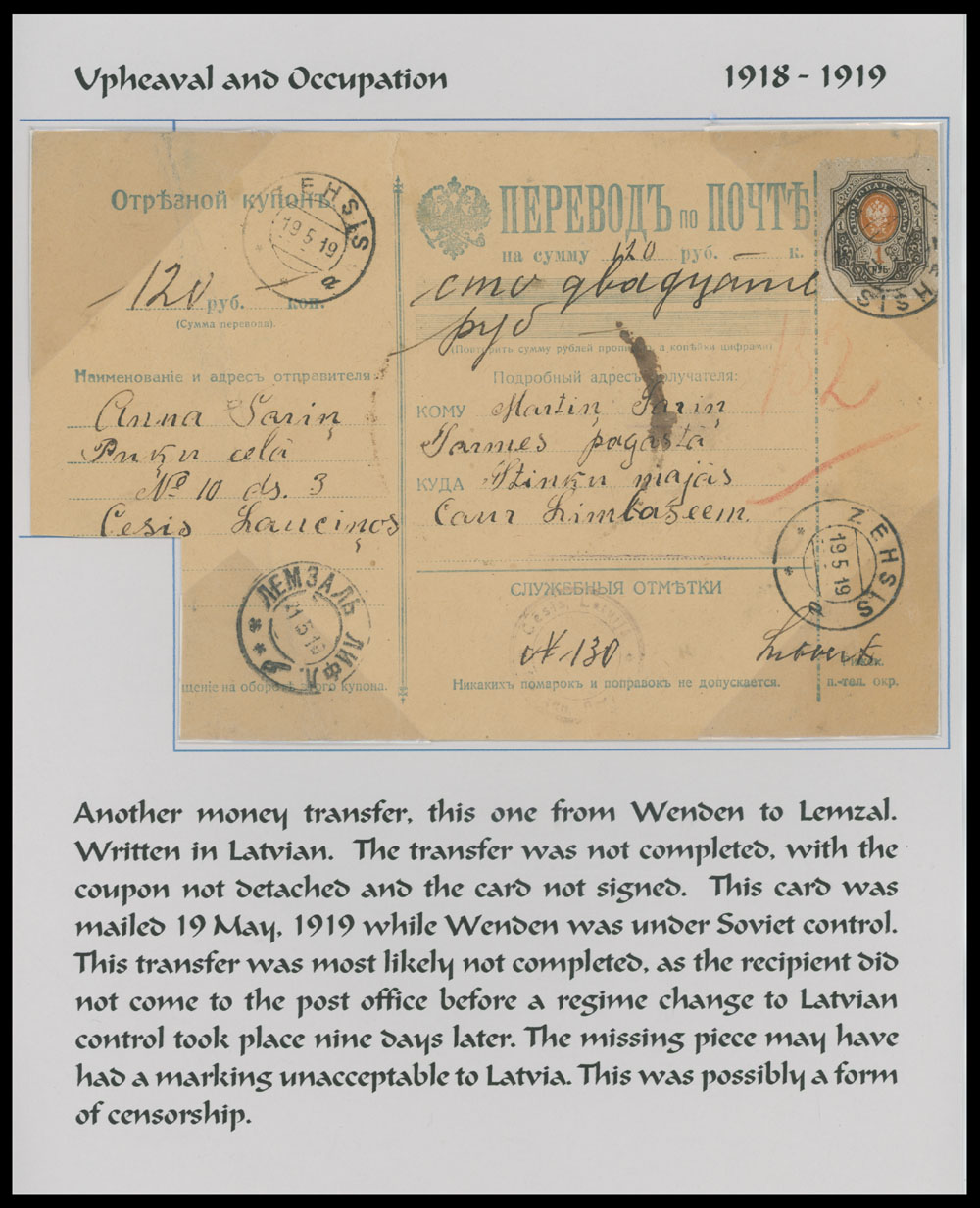 1919 (May 19), Money transfer for 120rub, franked by Imperial 1r brown, pale brown and orange (Scott #87), sent from Cesis (Wenden) to Limbazi (Lemsal), both parts together, receipt was trimmed at bottom left, all appropriate markings, arranged on page from the Collection, F/VF, Est. $150-$200