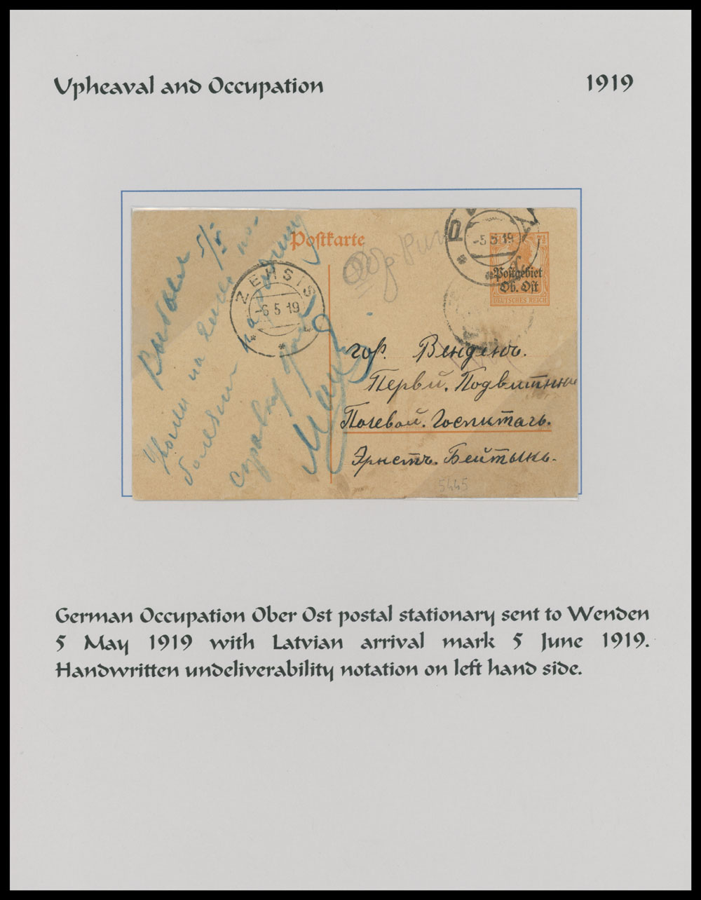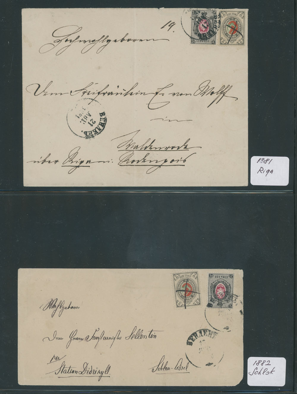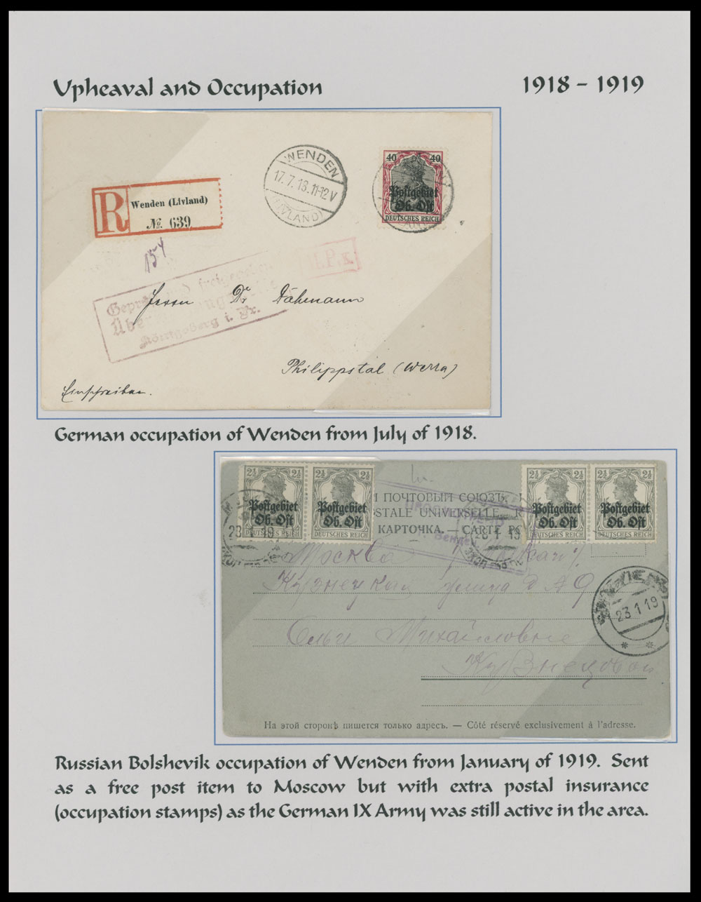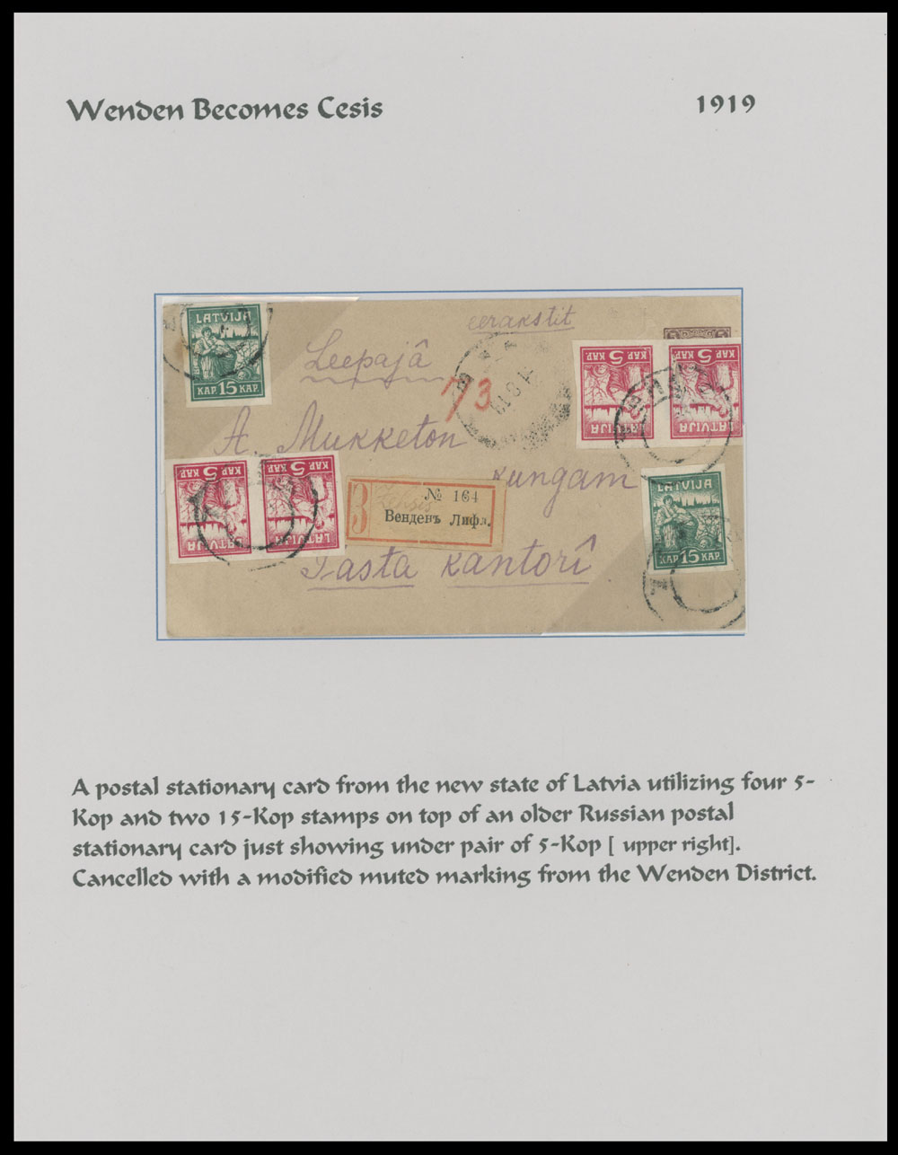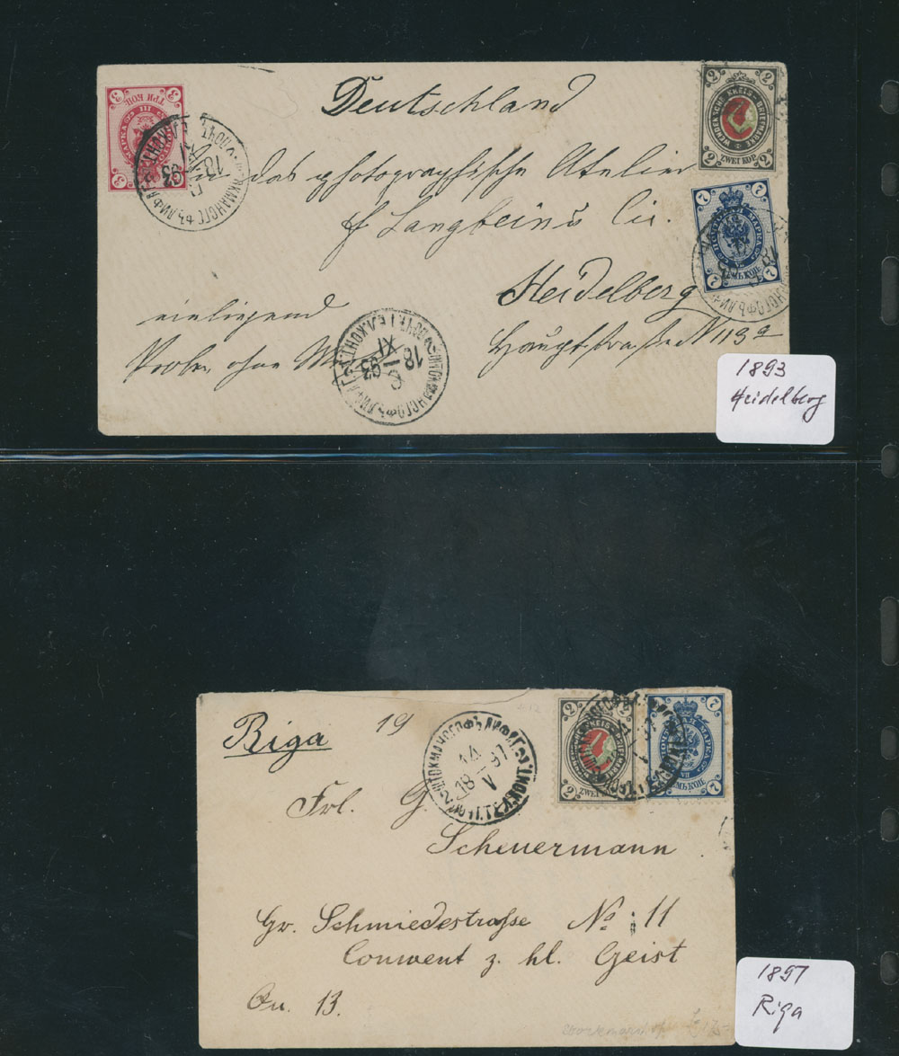1915-19, group of five items sent from Wenden, including stationery card to Copenhagen with due ”T” marking, two covers and one card sent during German Occupation of Latvia, and card franked with Independent Latvia stamps commemorating Liberation of Riga; in addition group of four early covers from 1881 to 1897, three with internal destinations and one is addressed to Germany, occasional flaws possible, still F/VF, Est. $600-$700