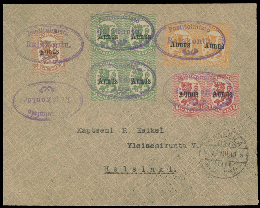 1919 (August 4), nine stamps overprinted ”Aunus” used on cover to Helsinki, tied by violet oval Rajakontu postal marking without a date, Manssila ”4.VIII.19” transit, no backstamp, VF and rare, Est. $400-$500 , Scott #N13 x4, N14 x2, N15 x2, N17