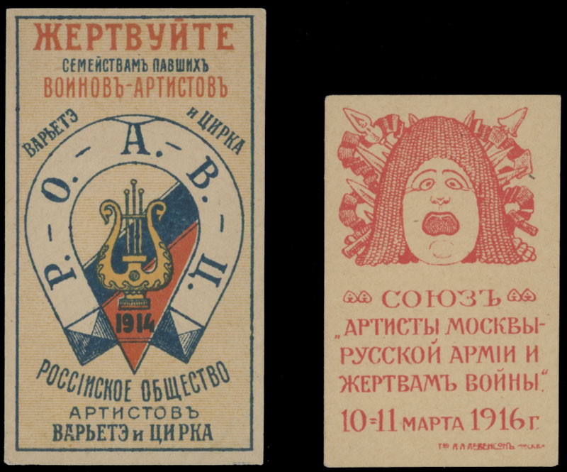1914-16, Russian Society of Variety Show and Circus Artists ”Donate to families of fallen warrior artists”; and Union of Moscow Artists to the Russian Army and Victims of War, two labels of no value indicated, fresh, VF and scarce, Est. $150-$200