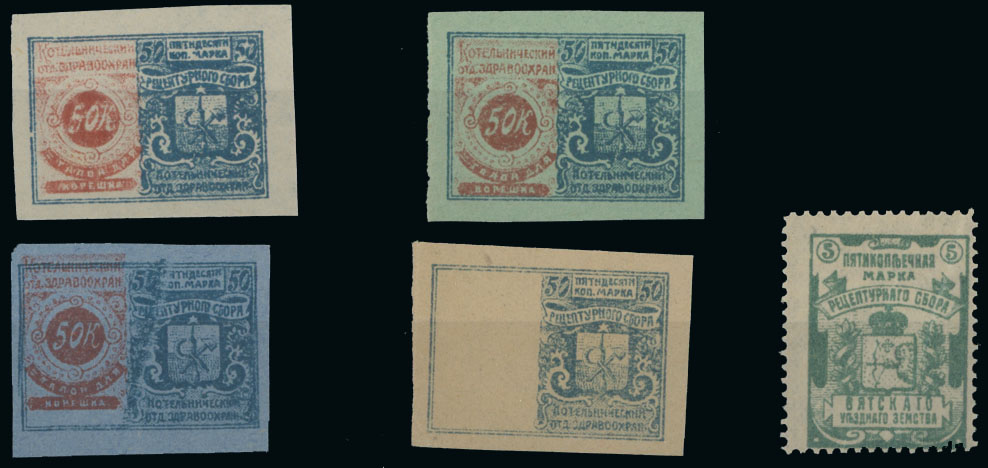 1917-18, Prescription Fee, Kotelnich 50k, imperforate set of four stamps printed on white, green, blue and yellowish paper, the last one without denomination at left; in addition Vyatka 5k bluish green, no gum as issued or full OG, mostly VF, Est. $150-$180