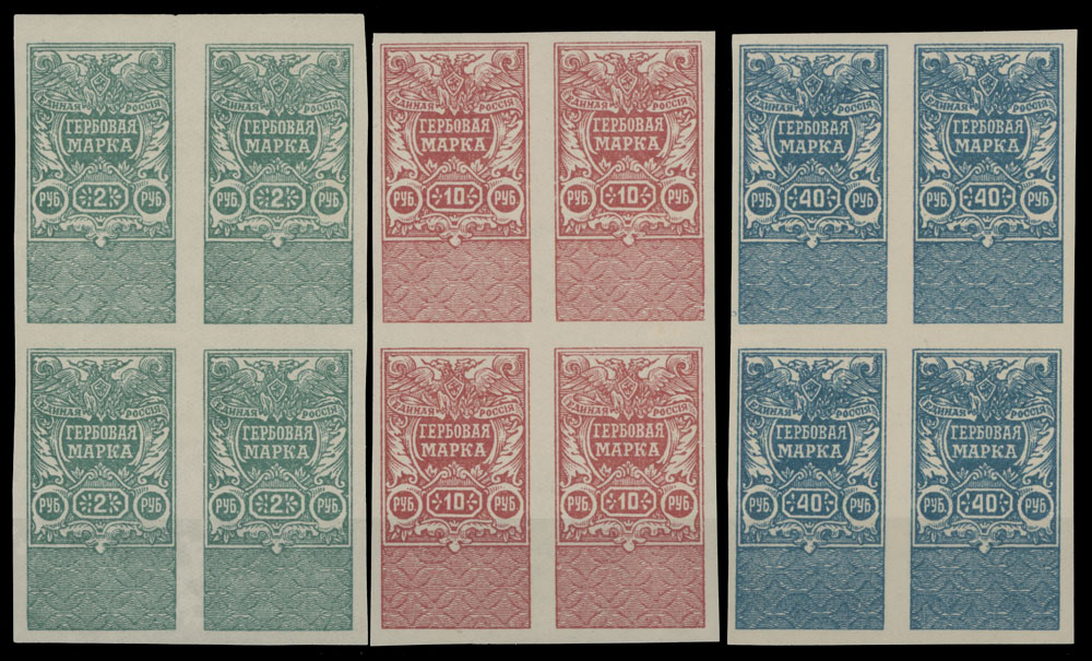 1920, Documentary Tax, 2r green, 10r red and 40r blue, three imperforate stamps in blocks of four, full OG, NH, VF, Mirsky Cat. #57, 58, 61, Est. $150-$200
