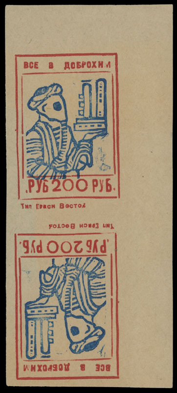 VOLUNTARY SOCIETY OF FRIENDS OF CHEMICAL DEFENSE AND CHEMICAL INDUSTRY – MIDDLE ASIA: 1924, 200r red and blue, vertical tete-beche pair, no gum as produced, VF and rare, Est. $200-$250