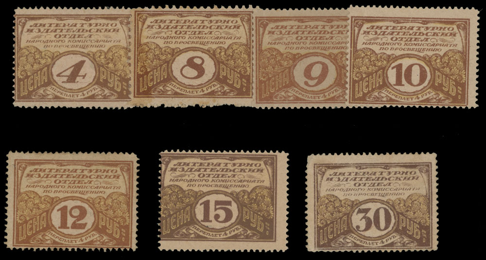 1920-23, Publishing Department, 4+4r – 30+4r, set of seven labels, no gum or part of OG, F/VF, Est. $300-$400