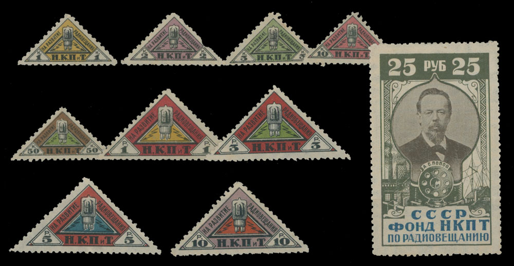 1926, 1k-10r, set of triangle stamps (less 5k) and Alexander Popov 25r, the total is ten stamps, stamp of 2k with pulled perf at right, others unused, no gum, or large part of OG (25r), F/VF, Mirsky Cat. #1/10, 11, Est. $150-$180