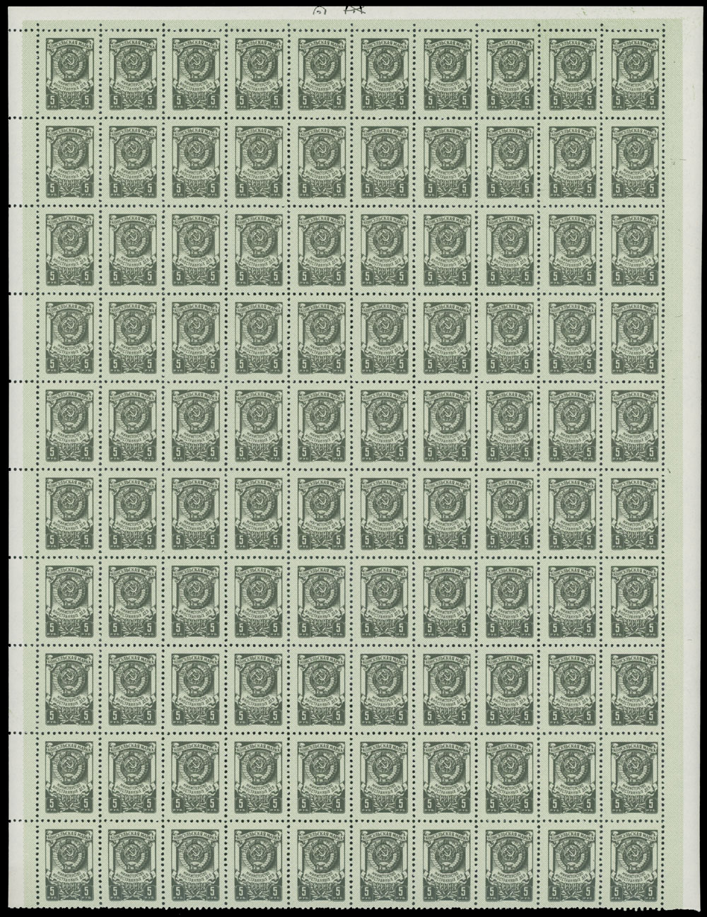 1975(c), 3rd Ministry of the International Affairs issue, 5r black on green rhombus network, pane of 100 without bottom margin, full OG, NH, VF, G. Mirsky Cat. #65, C.v. $500 as singles, Est. $200-$250