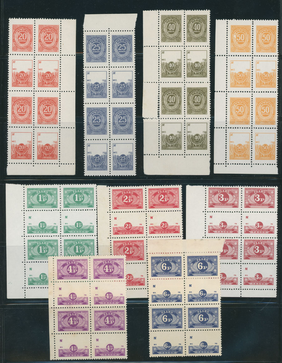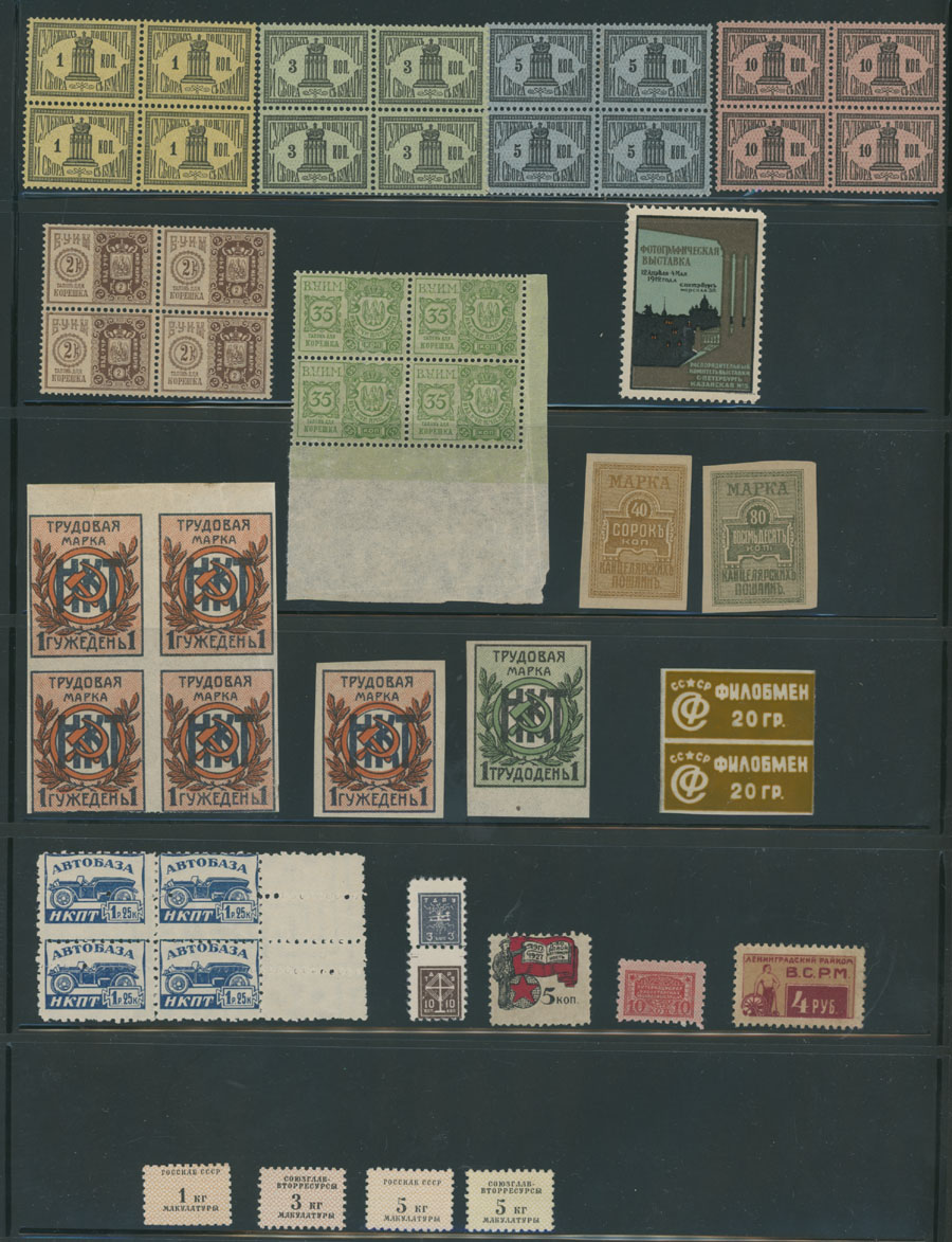 1887-1983, 84 stamps or vignettes in singles or multiples, starting with Imperial Court Fees of 1k-10k and VUIM of 2k and 35k all in blocks of four, then Chancellery Fees of South Russia, several different membership fee stamps and Radio Subscription stamps of the 3rd and 4th issues in blocks of four, mainly nice and fresh, F/VF, Est. $200-$300