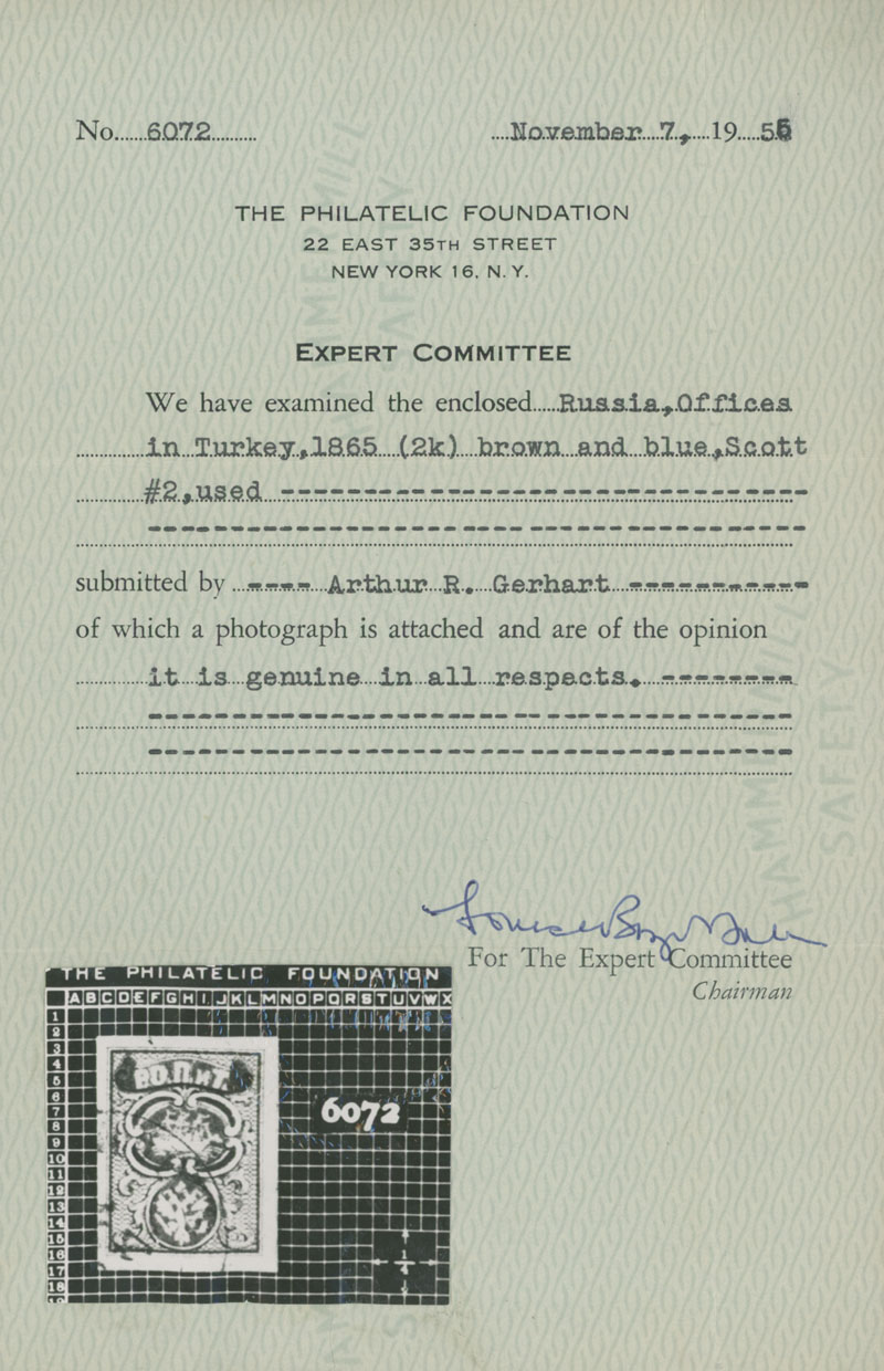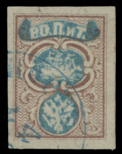 1865, R.O.P.iT., Steamship and Imperial Arms, 10pa (2k) brown and blue, nicely margined imperforate single with a part of ”PORT …4 MAYA” date stamp in blue, type IX by Tchilinghirian, fresh and VF, PF certificate, C.v. $750, Est. $400-$500 , Scott #2