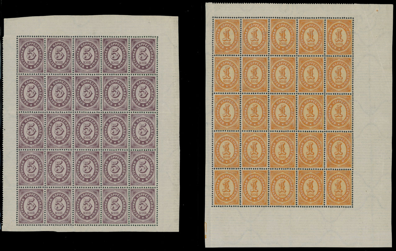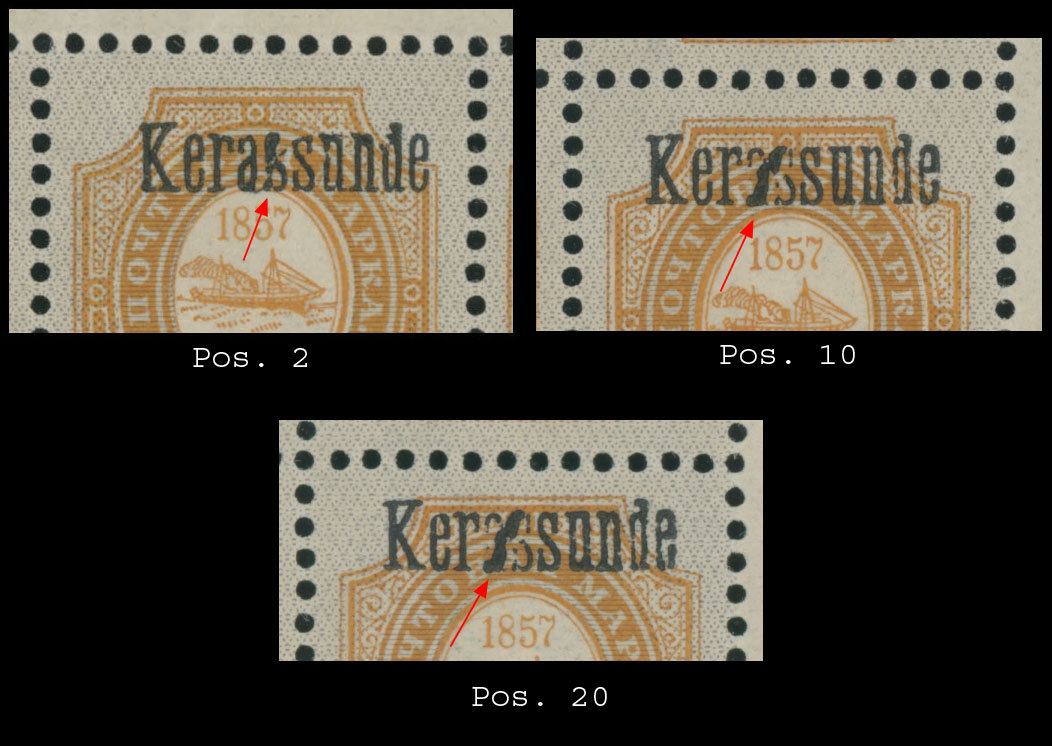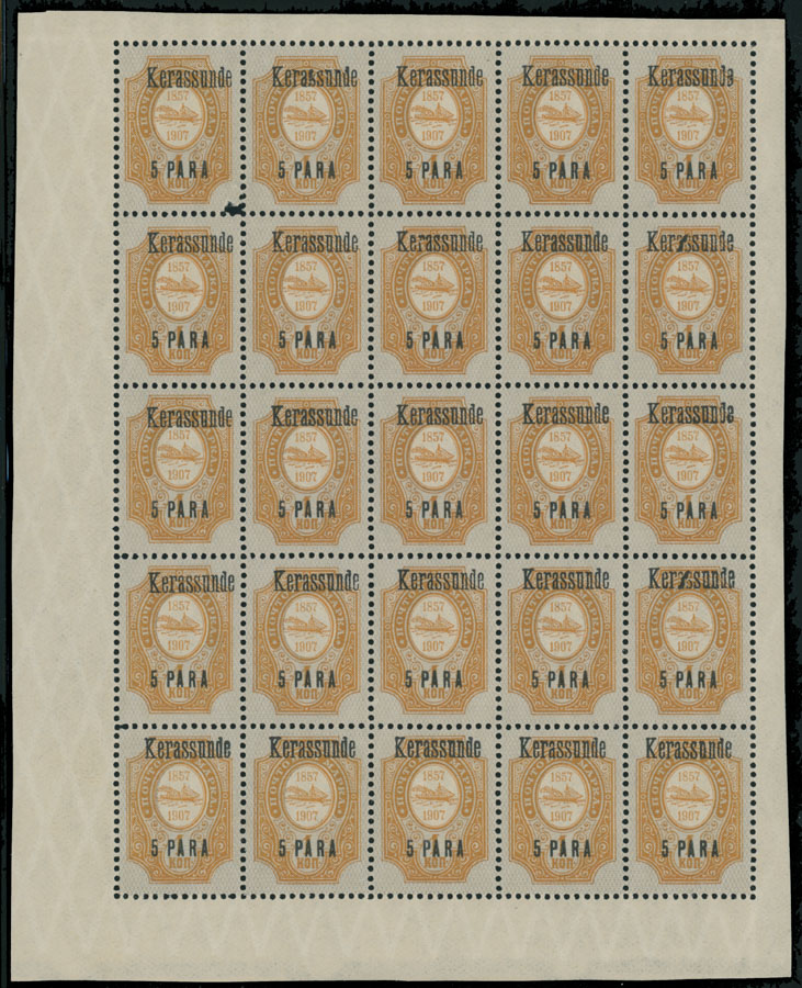 1884, Numerals, 1k orange and yellow, 5k lilac, printed on horizontally laid paper, complete panes of 25; black overprint ”Kerassunde” over 5pa/1k yellow and pale lilac, complete pane of 25, significantly broken overprint letters on positions 2 (first ”s”), 10 and 20 (”a” and ”s”), occasional separations, damaged stamp on position 1 of No.91, full OG, NH, mostly VF, Est. $200-$250, Scott #23, 25, 91