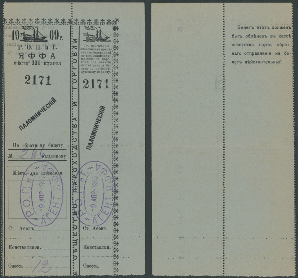 1909, Steamship R.O.P. iT. ticket on line Jaffa – Odessa via St. Athon and Constantinople, comprised of both parts (ticket and receipt), pre-printed ”Pilgrimage”, violet oval marking ”R.O.P.iT. Agency Jaffa. 9.APR.1909”, slight horizontal fold and minor discoloration on the left, still F/VF and very rare intact historical piece, Est. $400-$500